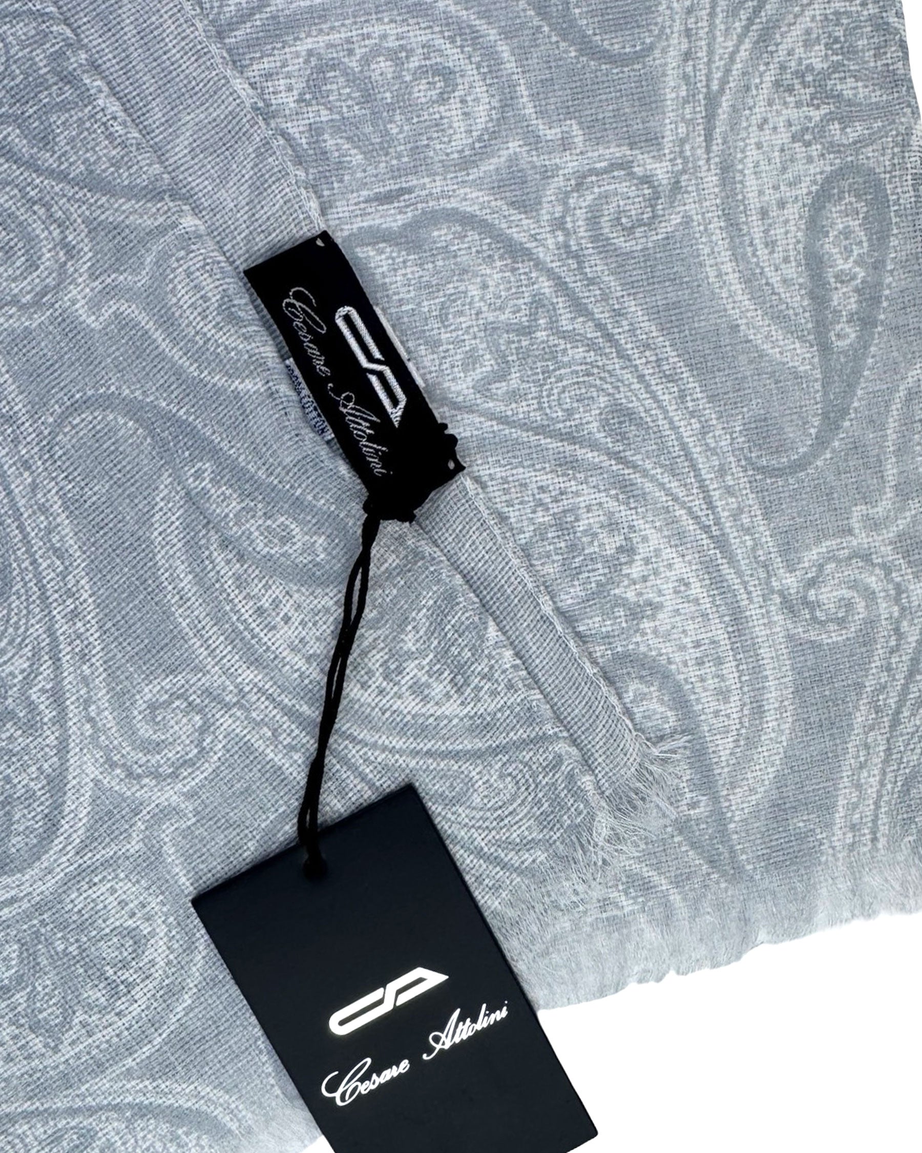 Genuine Attolini scarf, gray white paisley design, light weight cotton, short eyelash fringe, made in Italy. Cesare Attolini: sartorial quality men designer shawls and scarves, men collection at outlet prices. Shop discount Attolini scarves.