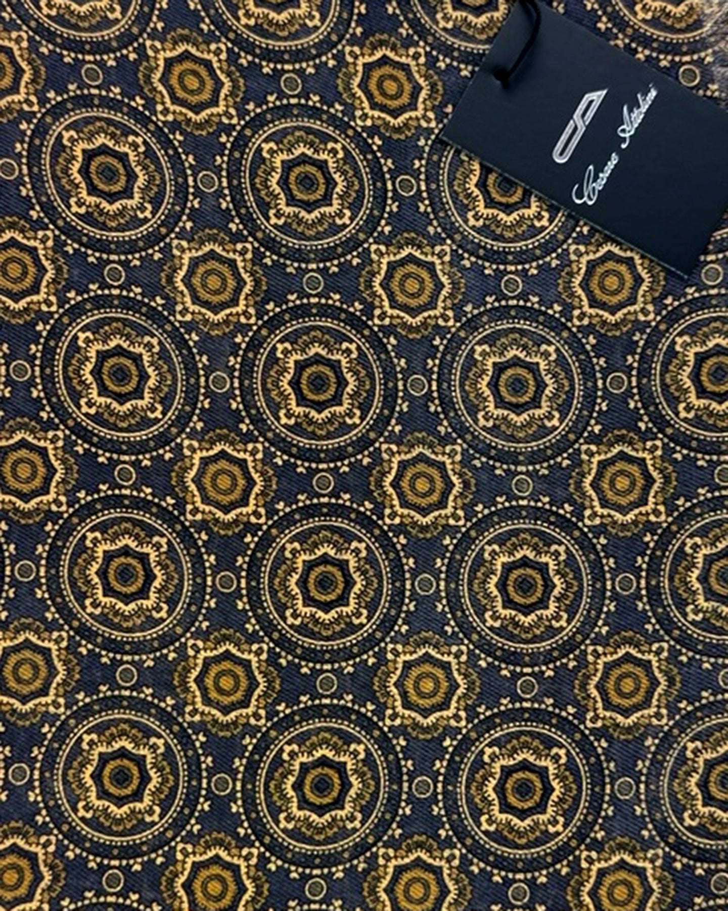 Genuine Attolini scarf, Black Brown Orange-Gold Medallion design, short eyelash fringe, fancy lightweight cotton cashmere, made in Italy. Cesare Attolini: sartorial quality men designer shawls and scarves, men collection at outlet prices. Shop discount Attolini scarves.