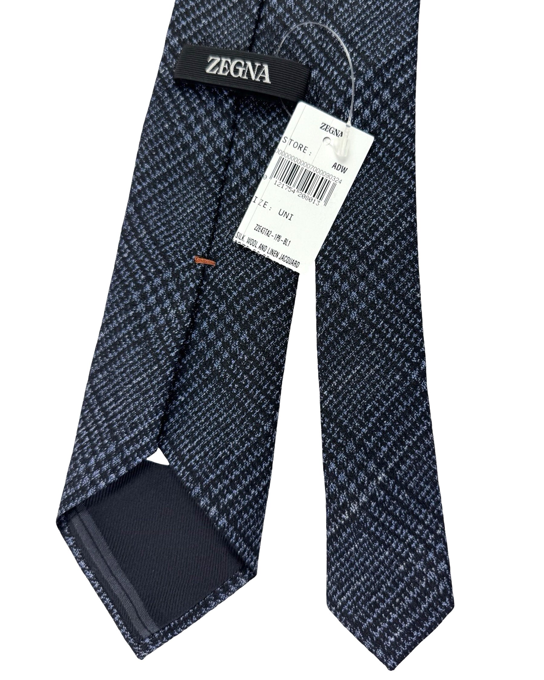 Ermenegildo Zegna Tie Black Midnight Blue Plaid - Wool Silk Linen