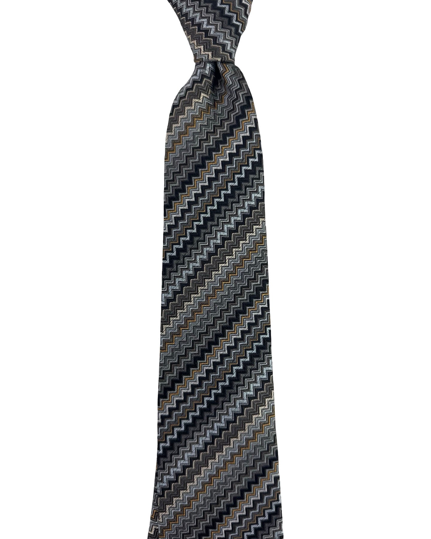 Authentic Missoni tie, dark charcoal ground with tonal chevron striping in silver, grey, and muted gold, jacquard silk, hand made in Italy. Genuine Missoni men collection designer neckties/ accessories at outlet prices online.