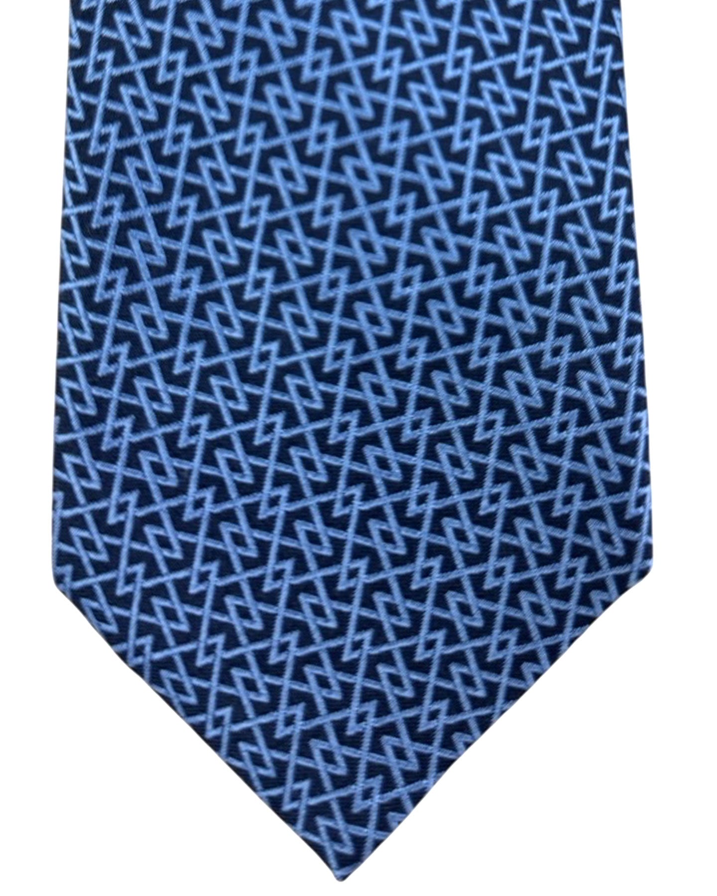 Genuine Emporio Armani tie, navy blue geometric pattern, jacquard silk, hand made in Italy. Luxury Armani men collection online. Discount men designer ties.
