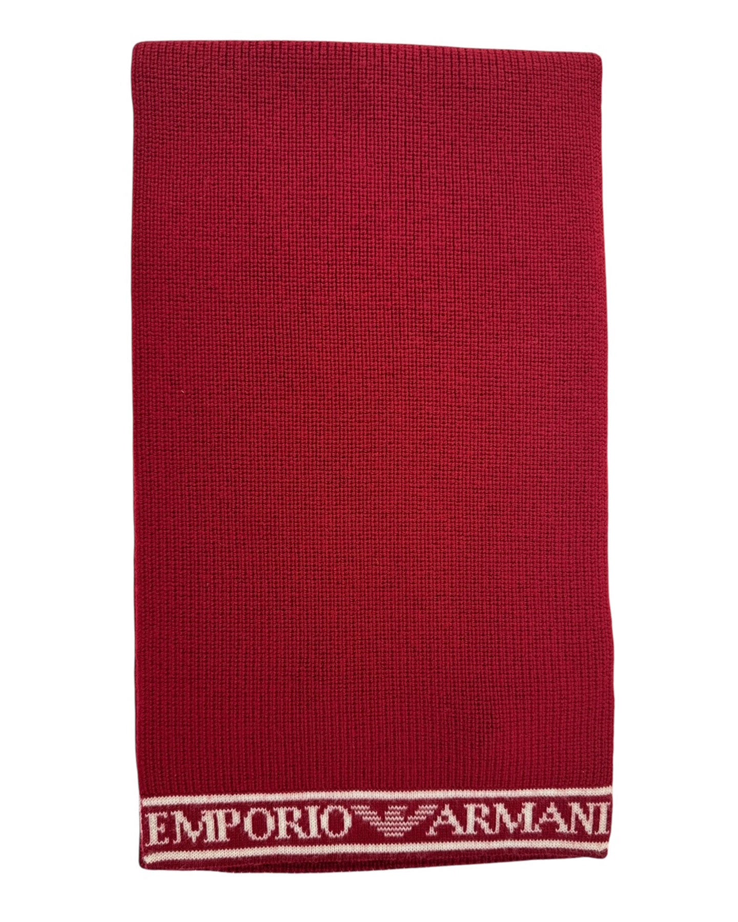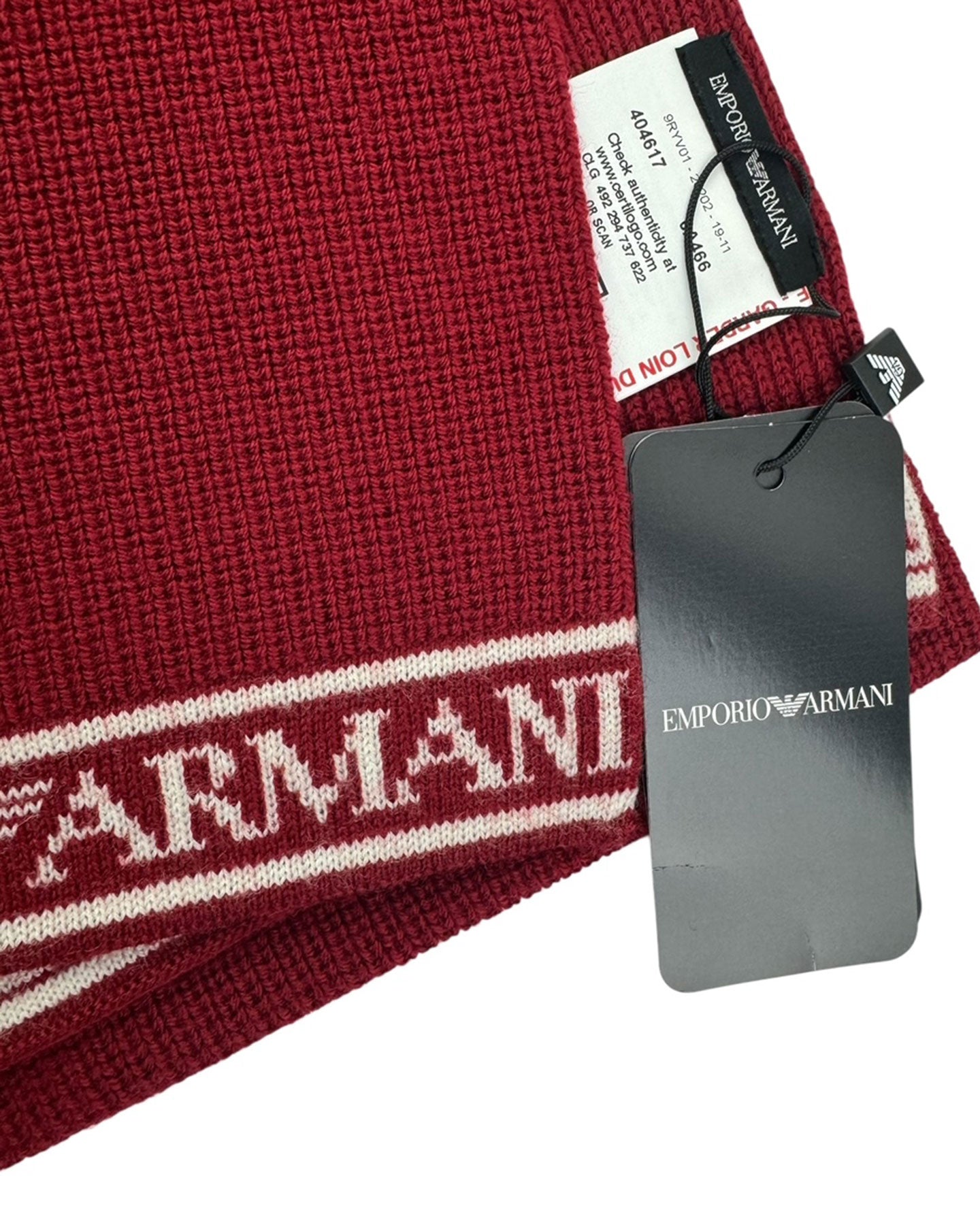 SALE - Genuine Emporio Armani scarf, bordeaux solid pattern with Emporio Armani logo on the edge, medium weight soft wool, made in Italy. Luxury Armani men collection online.