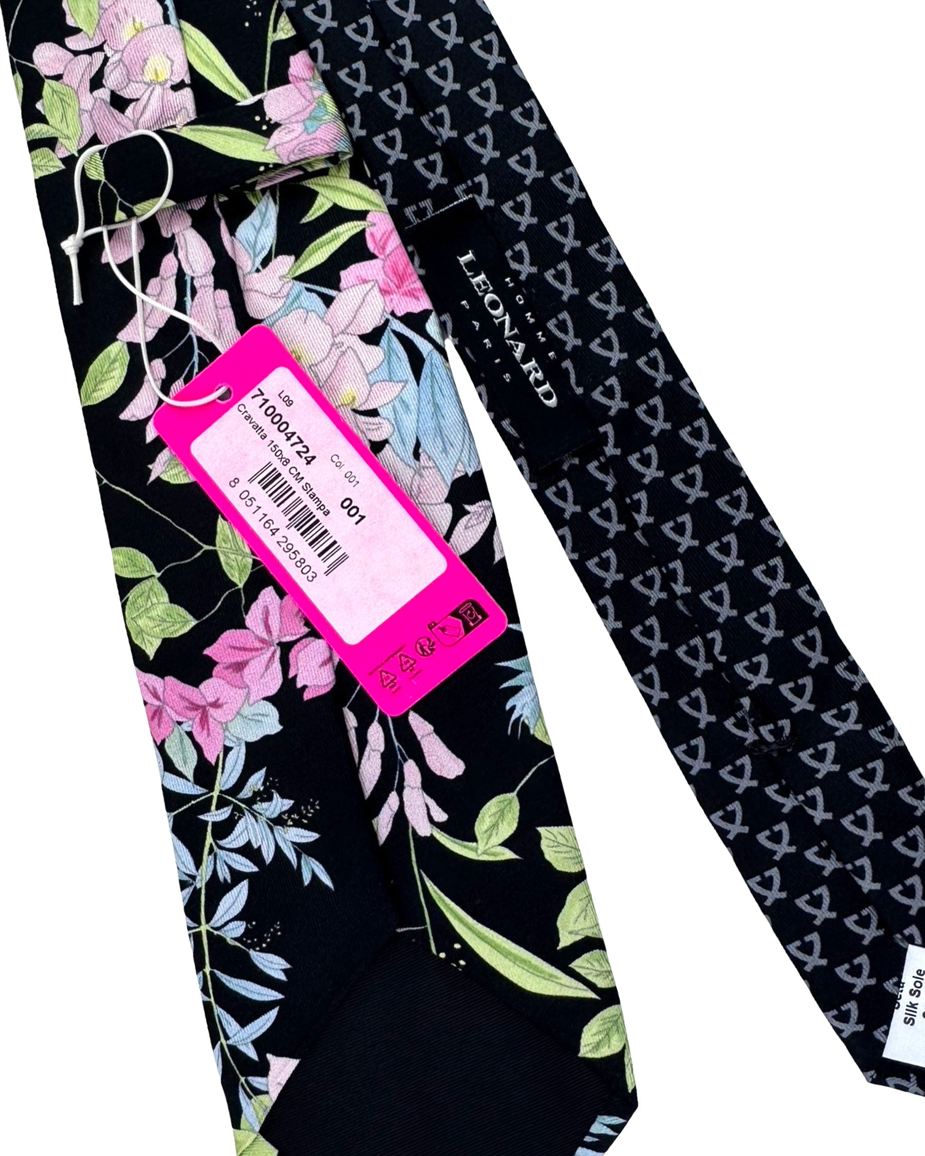 Authentic Leonard tie, black background with pink floral, printed silk, hand made in Italy. Luxury accessories, hand made in Italy: Leonard Paris is known for it stunning colorful and unique floral designs.