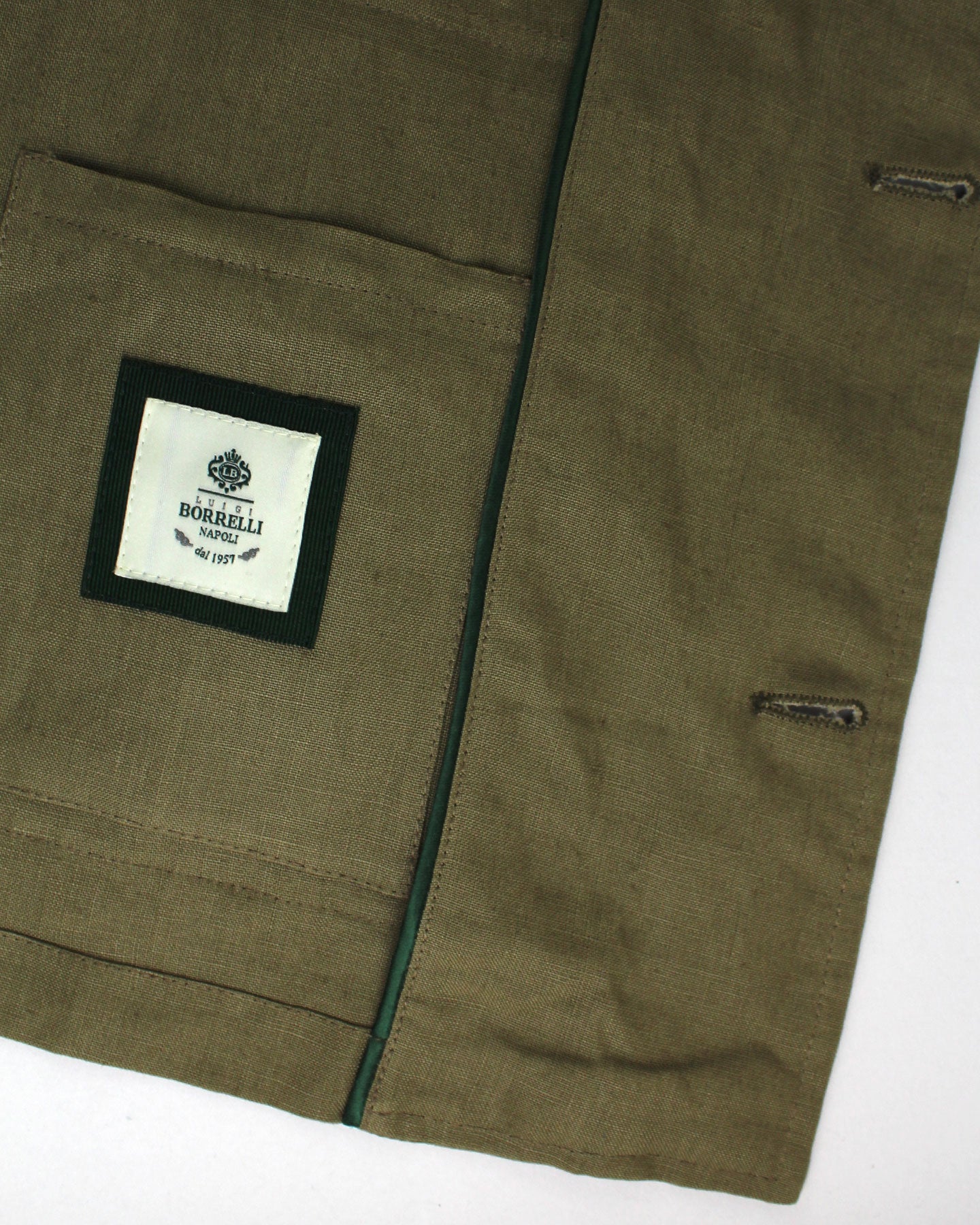 Genuine Luigi Borrelli coat, button front, forest green, linen, unlined, 4 button pockets, button cuffs, sartorial, LB logo behind back of collar, hand made in Italy. Sartorial quality men sport jackets and suits by Luigi Borrelli. Shop Bespoke Sport Coats.