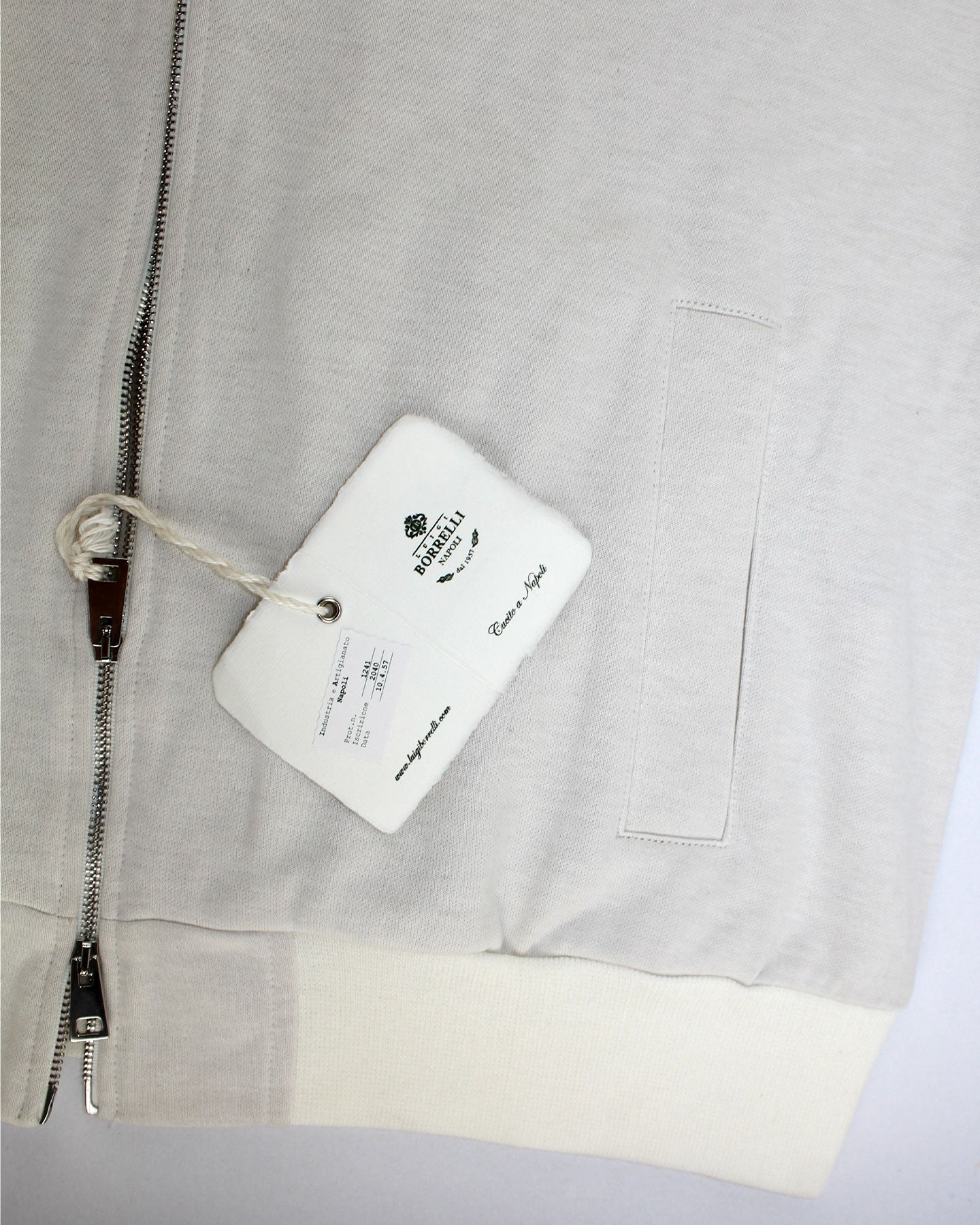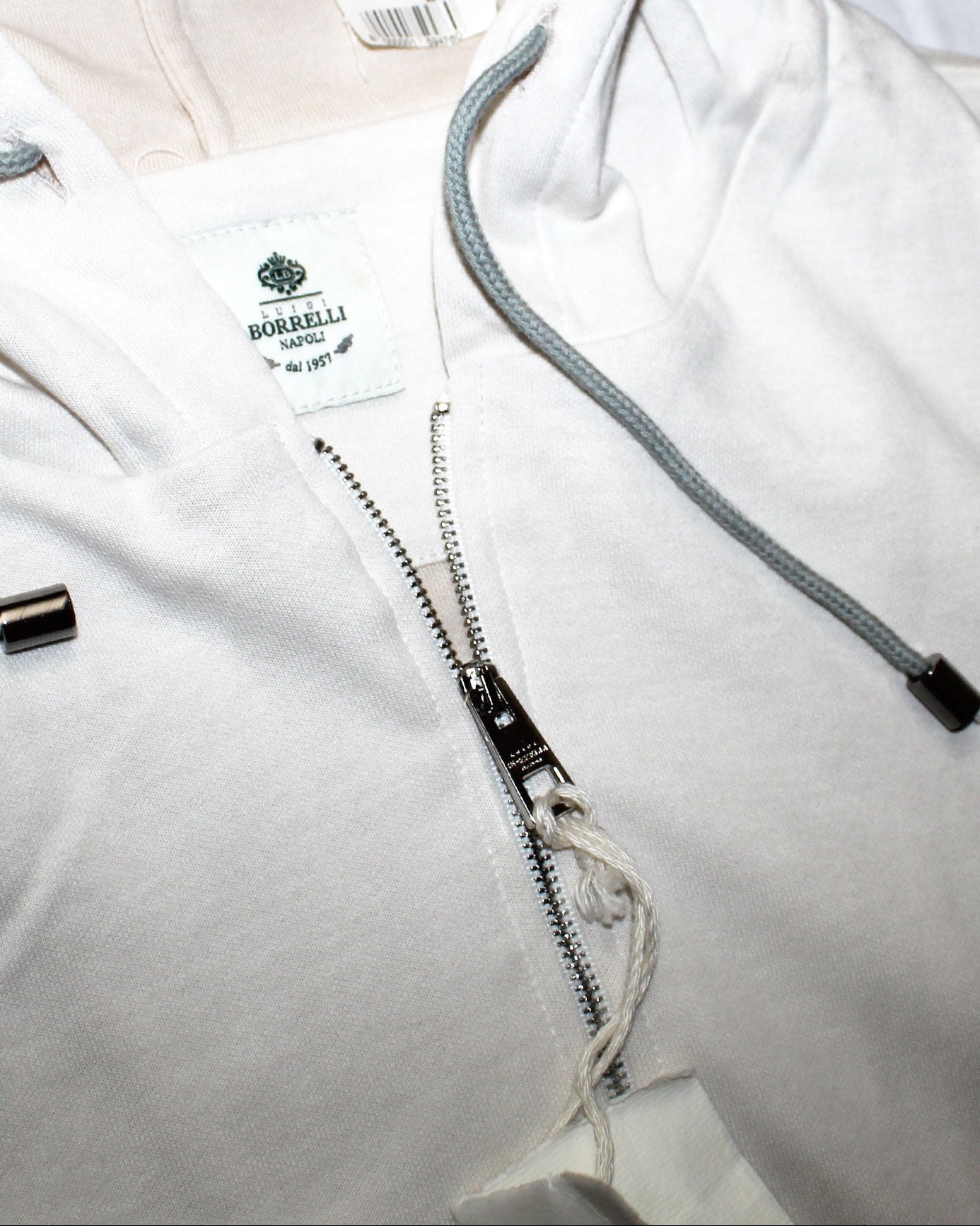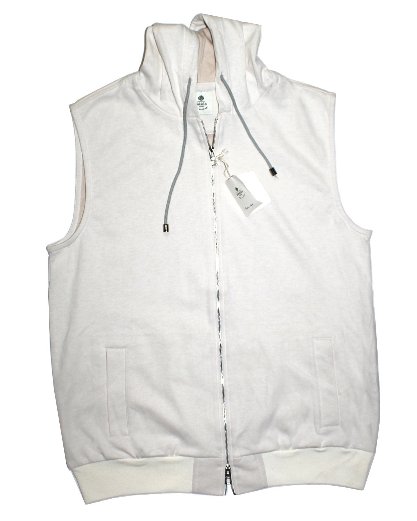 Authentic Luigi Borrelli sleeveless zip hooded sweater, oatmeal (almost white), modern fit, double zip closure, vertical welt side pockets, cotton, made in Napoli, Italy. Shop the sartorial dress shirts, polo shirts and ties of the Luigi Borrelli men collection.