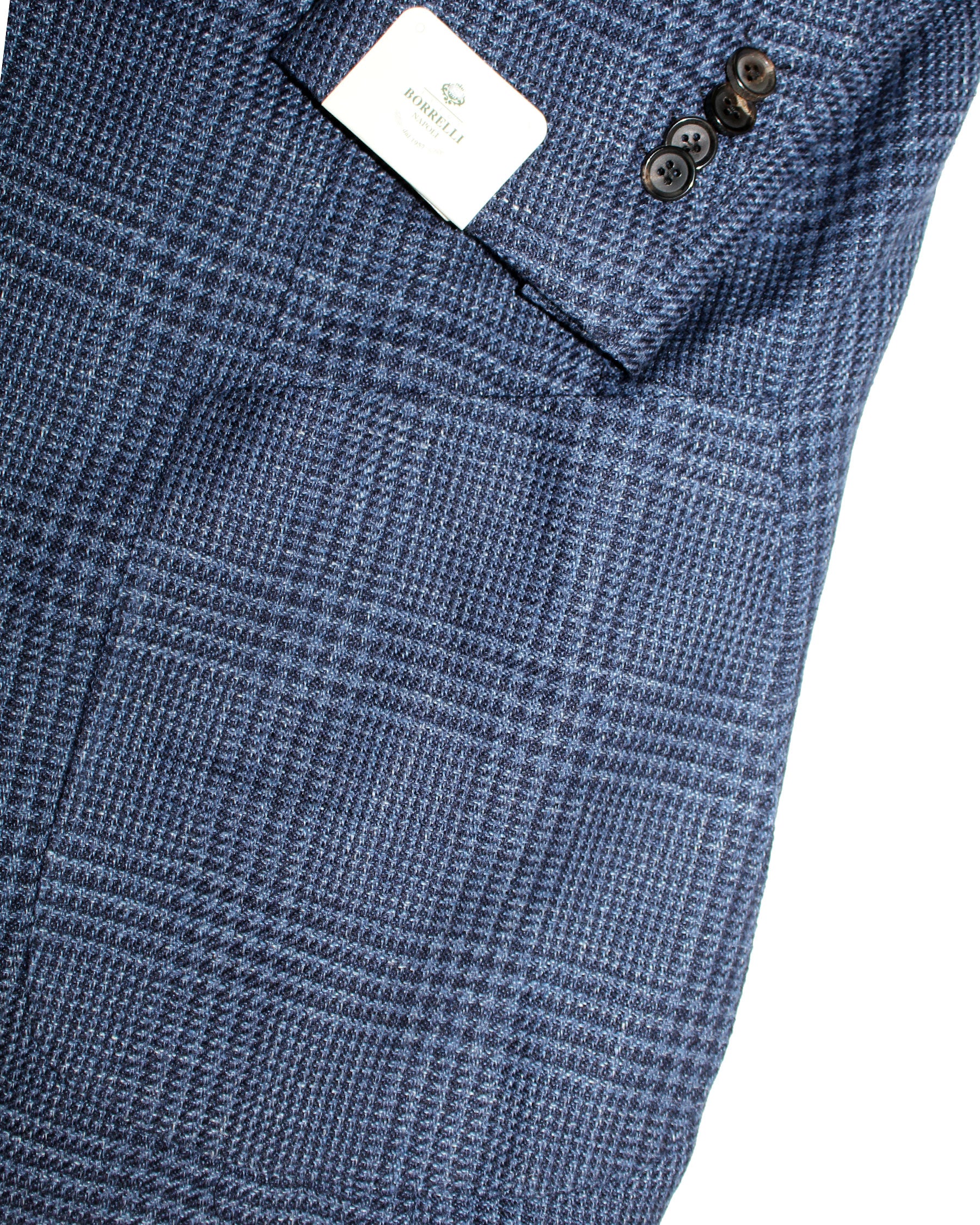 Authentic Luigi Borrelli sport coat, two button, peak lapel, dark blue plaid, wool/ silk/ linen, unlined jacket/ blazer, soft shoulders, hand made in Italy. Sartorial quality men suits by Luigi Borrelli, hand made in Italy.