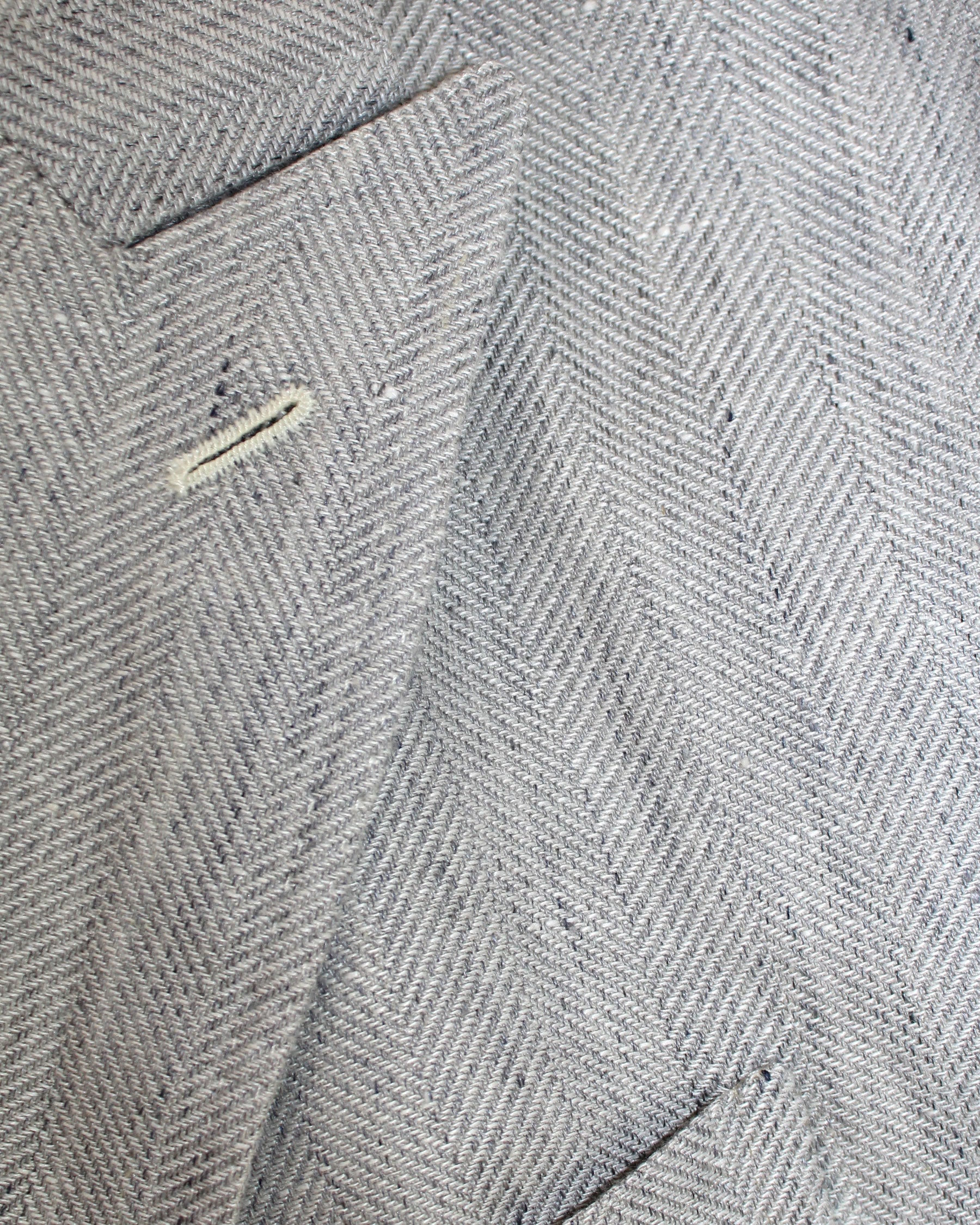 Genuine Luigi Borrelli sport coat, two button, peak lapel, gray tonal herringbone stripes, wool/ silk/ linen, unlined jacket/ blazer, soft shoulders, hand made in Italy. Sartorial quality men suits by Luigi Borrelli, hand made in Italy.