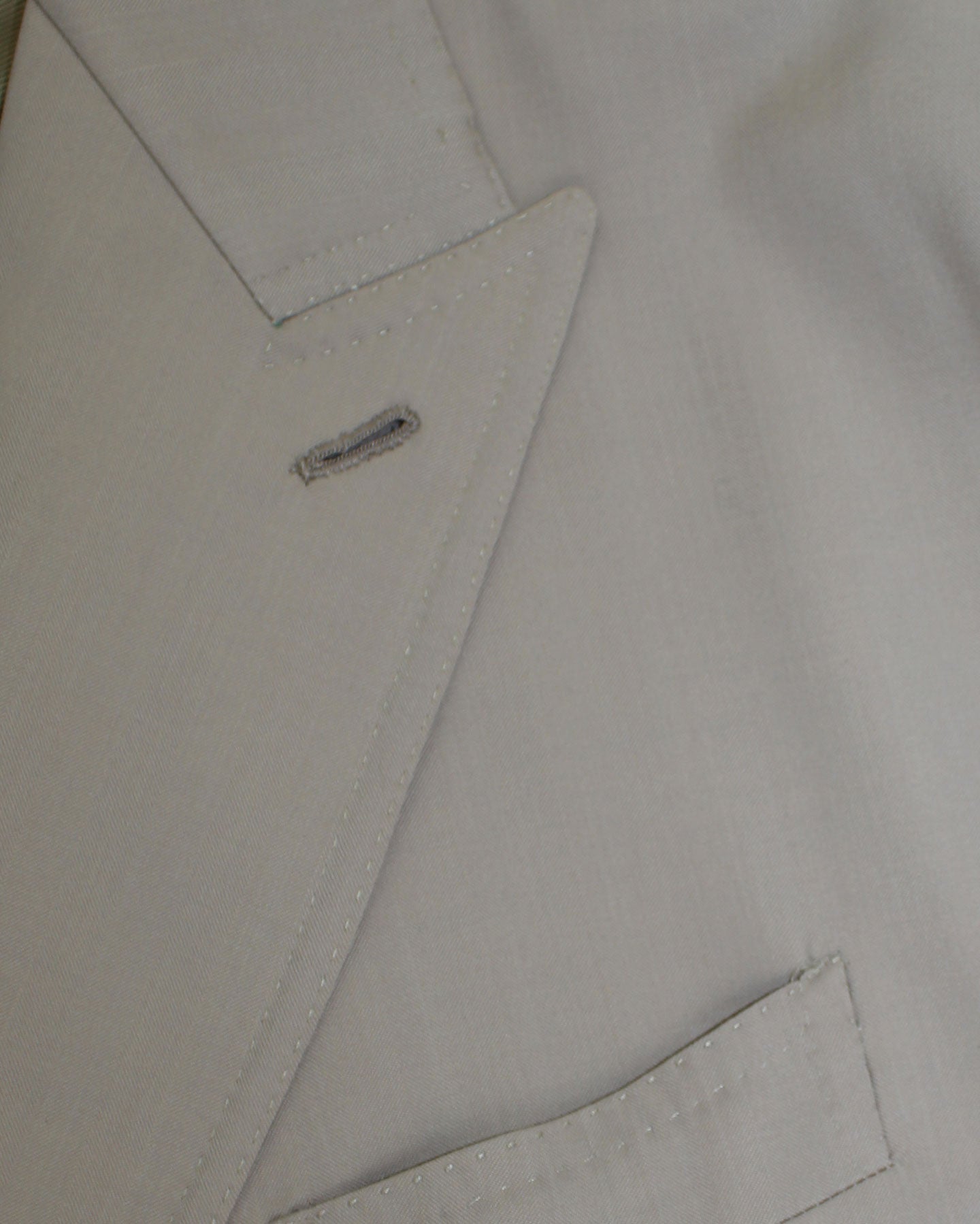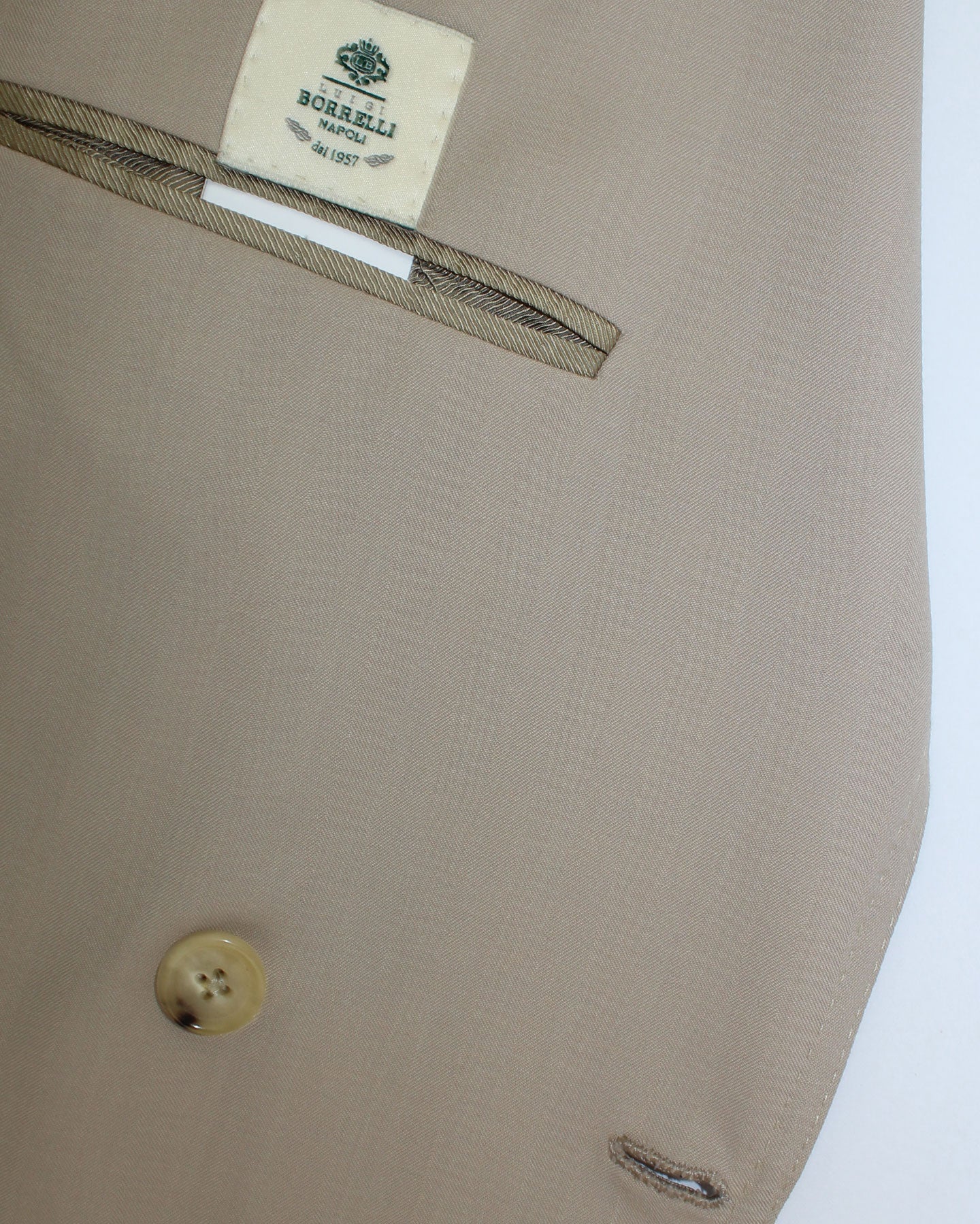 Genuine Luigi Borrelli double breasted sport coat, beige design, wool, unlined, bucket pockets, peak lapel, sartorial, hand made in Italy. Sartorial quality men sport jackets, blazers and suits by Luigi Borrelli. Shop Bespoke Sport Coats.