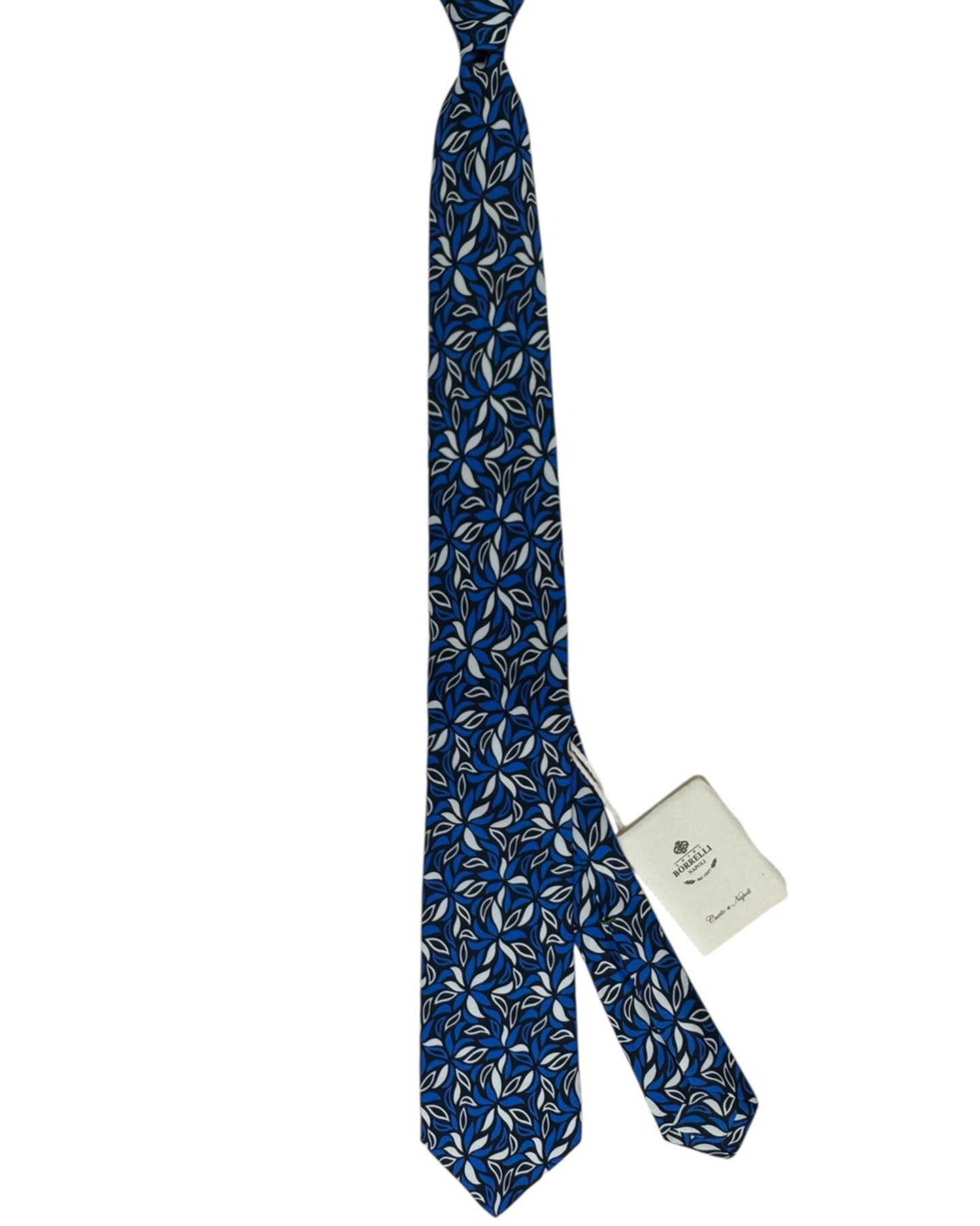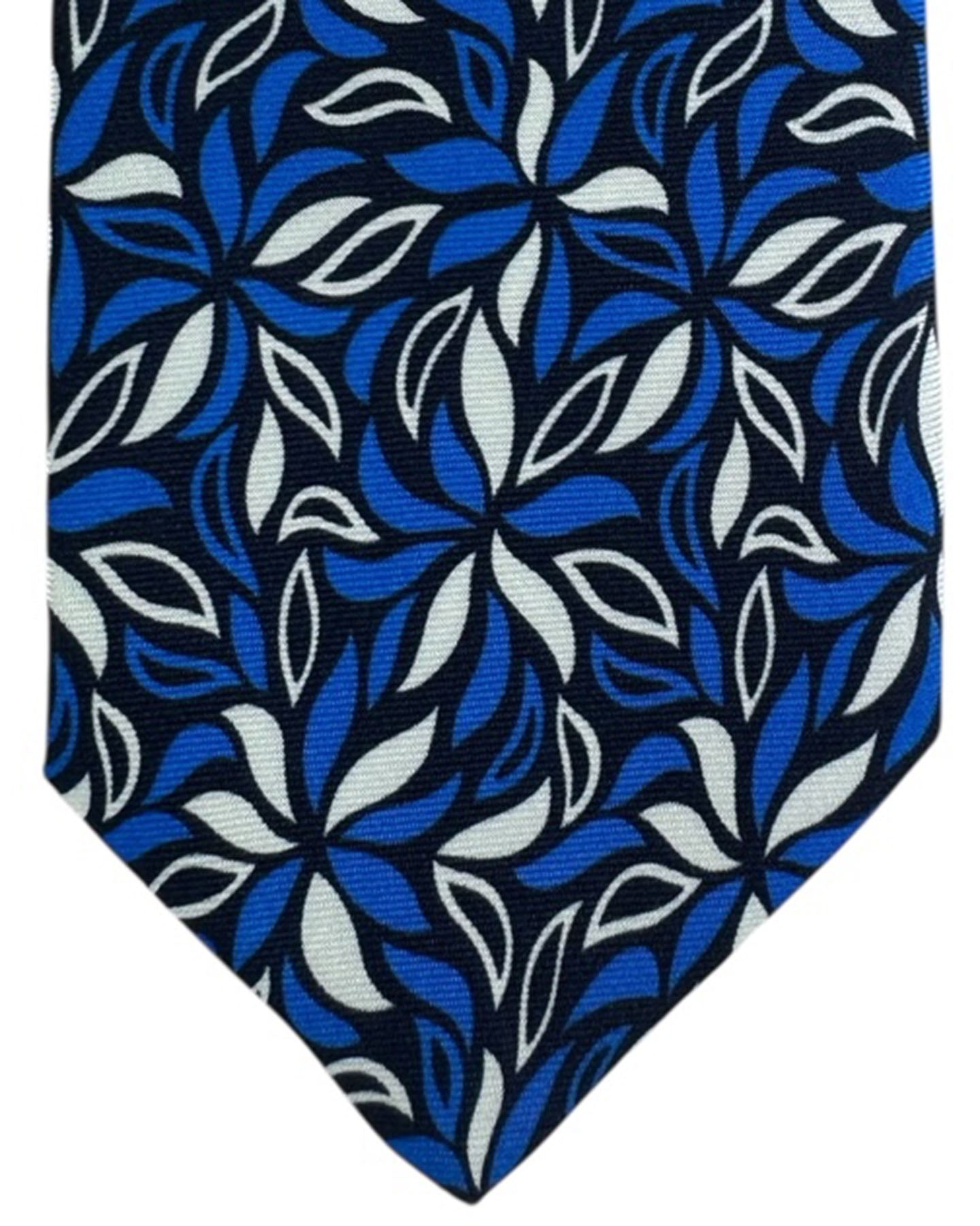 Neapolitan sartorial style: Authentic Luigi Borrelli tie, bold navy tie with swirling leaf-like motifs in shades of cobalt blue and white, arranged in a floral burst pattern, self tipped, hand made in Italy. Genuine Luigi Borrelli men collection online. Sartorial quality Italian ties at discounted prices.