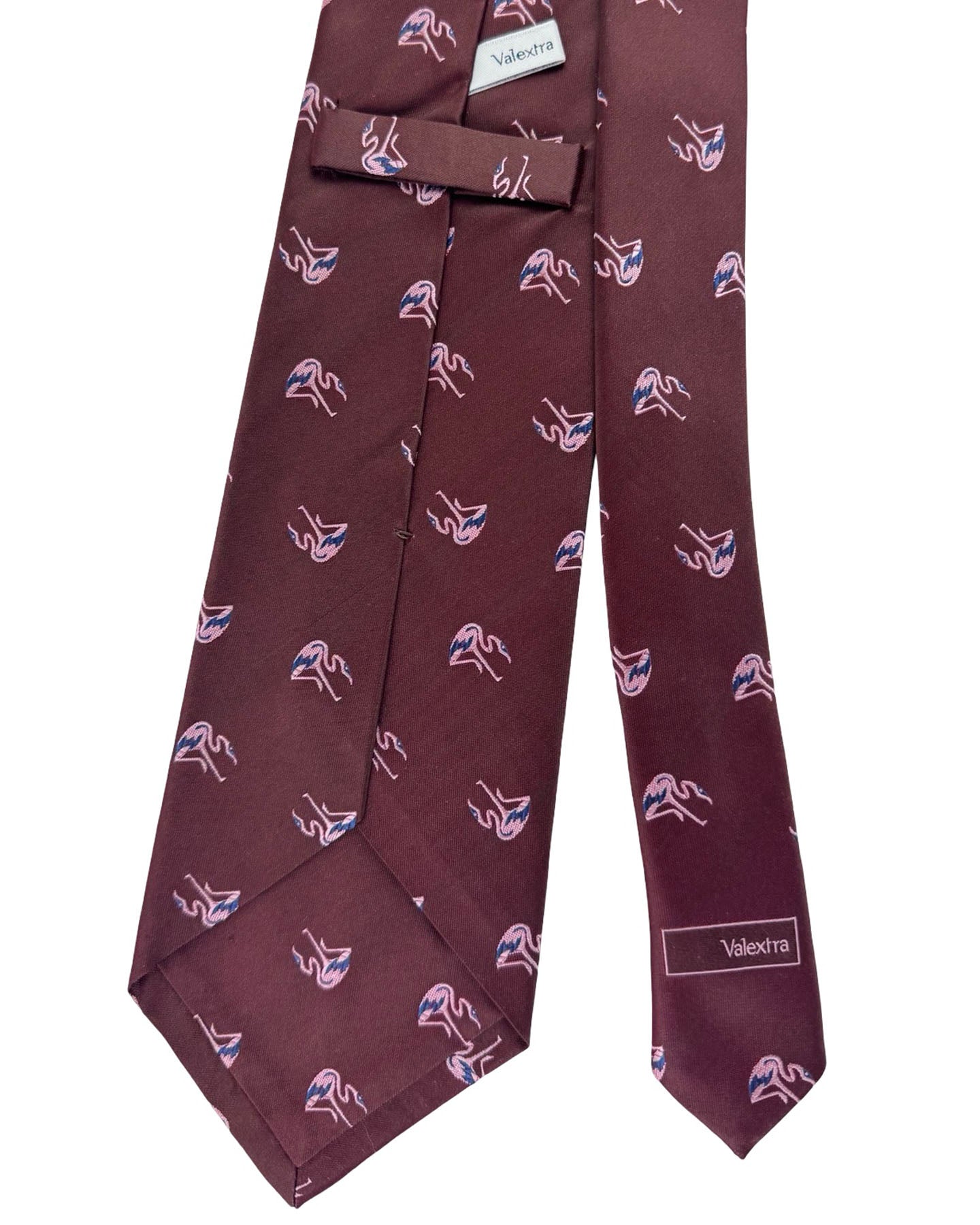 Genuine Valextra tie, burgundy brown background with pink flamingo, wide 9.5cm width, silk, self tipped, high quality, hand made in Italy. Discount luxury designer ties, Valextra men fashion accessories at outlet prices.