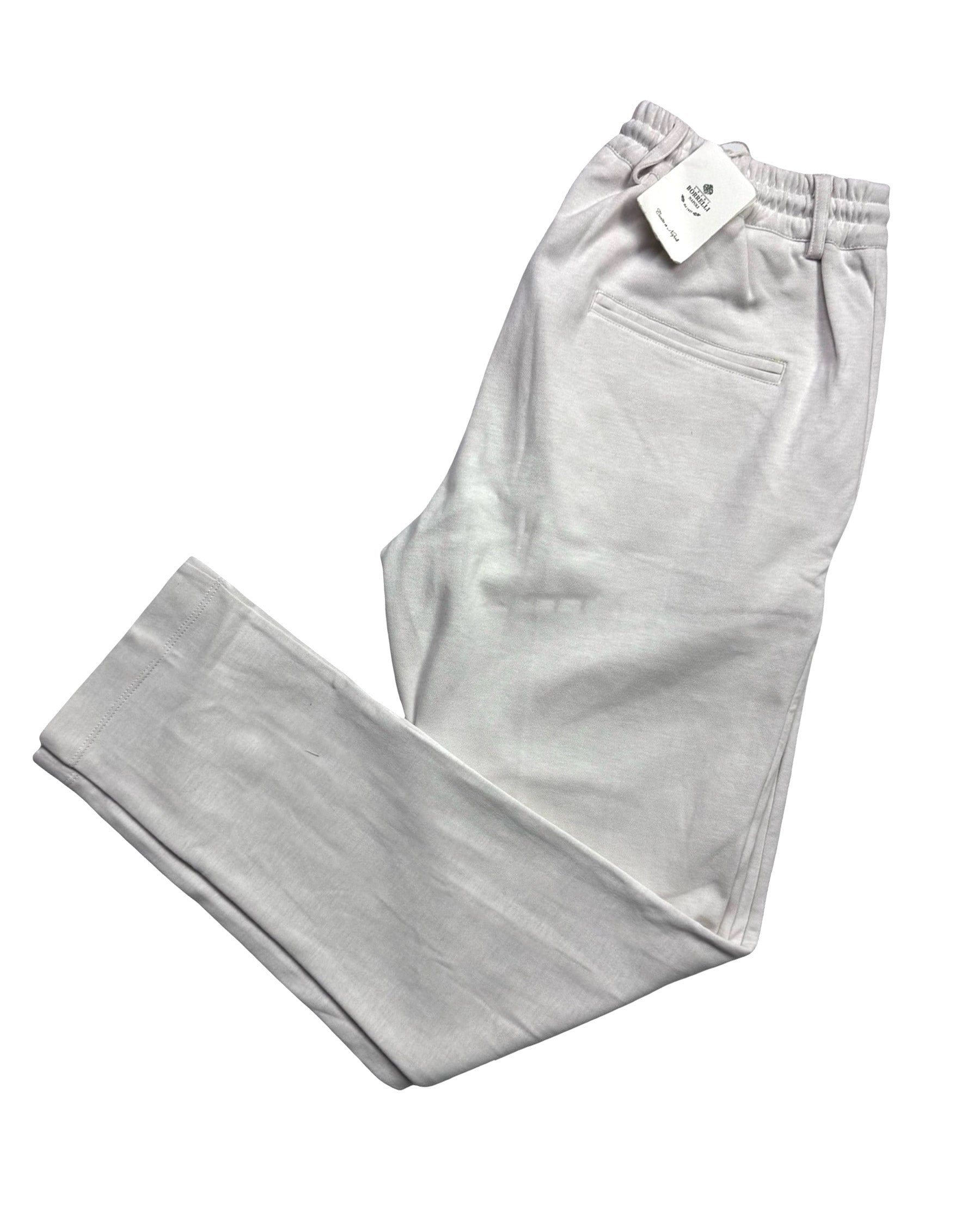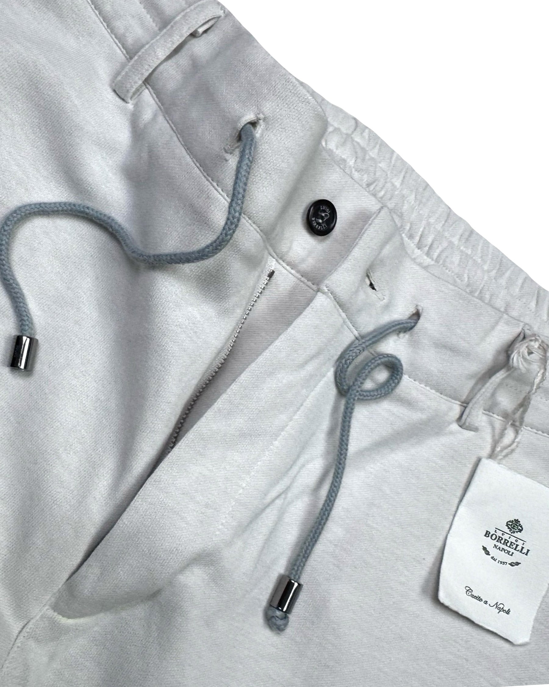 Top quality: Genuine Borrelli stylish jogger pants, slim fit, light oatmeal (white-beige), cotton, zip fly, logo drawstrings, hand made in Italy. Luigi Borrelli Napoli men collection, hand made jeans. View all men jogger pants. Shop matching zip sweater!