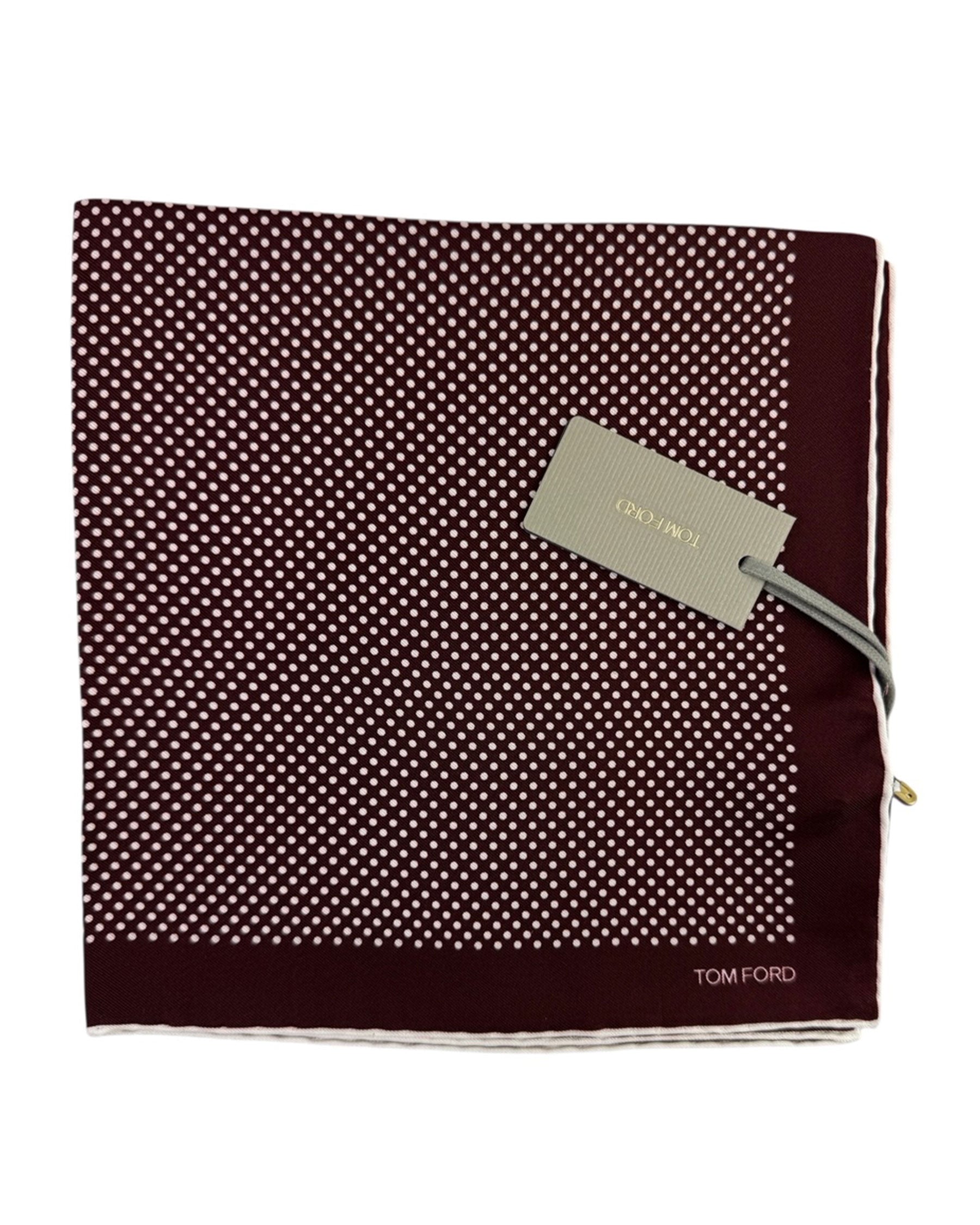 Genuine Tom Ford silk pocket square, maroon white dotted design, hand stitched border, hand made in Italy. Authentic Tom Ford men collection online at outlet prices. Shop Tom Ford pocket squares.