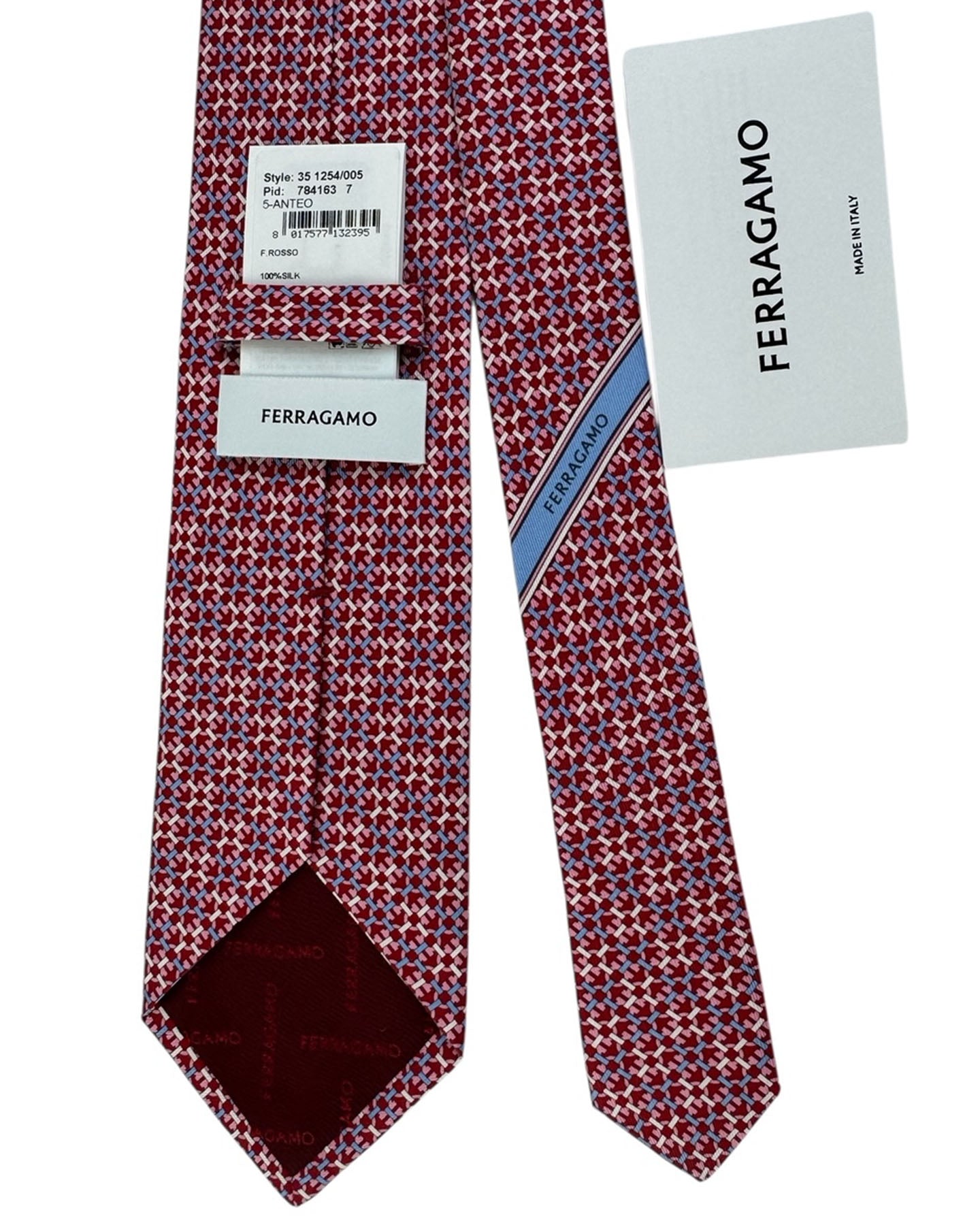 New 2025/ 2026 Fall/ Winter Collection: Authentic Salvatore Ferragamo tie, red pink Gancini design, printed silk, hand made in Italy. Original Salvatore Ferragamo ties online, men collection.