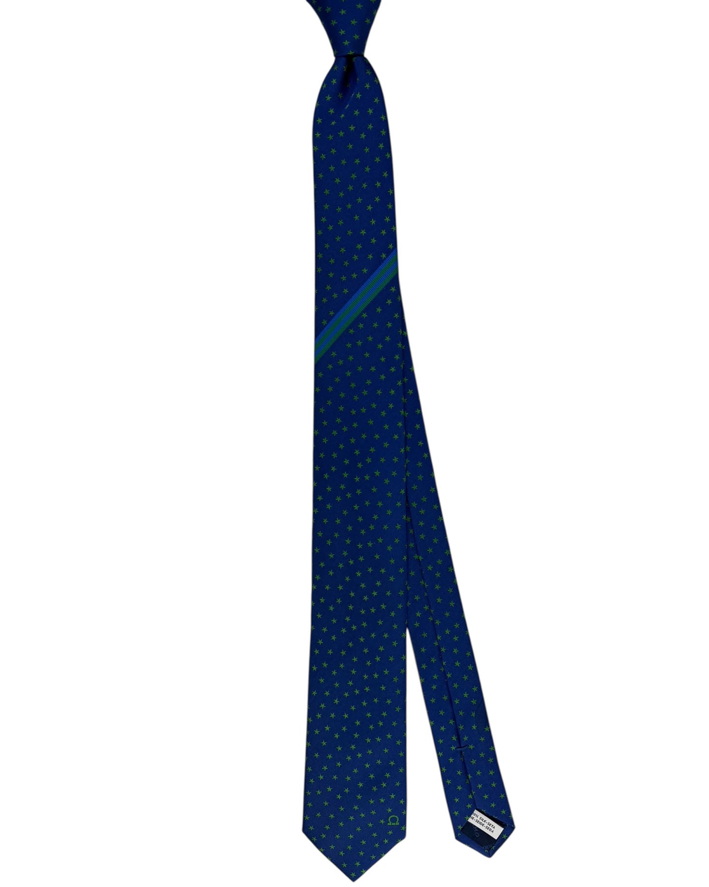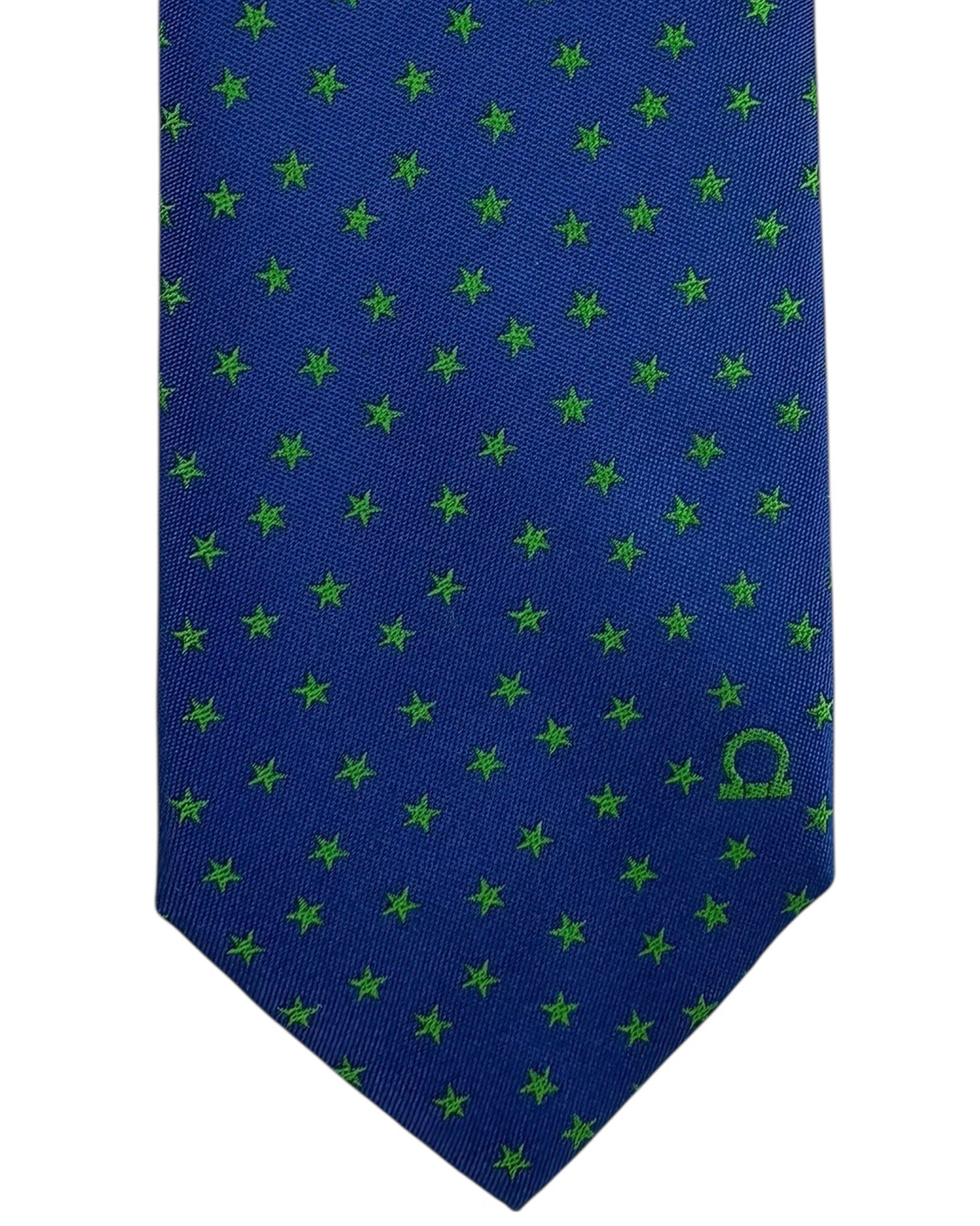 Authentic Salvatore Ferragamo tie, royal blue green stars, narrow cut, silk, hand made in Italy. Genuine discount Ferragamo ties online, Ferragamo men collection at outlet prices. The most popular high-end novelty tie in the world.