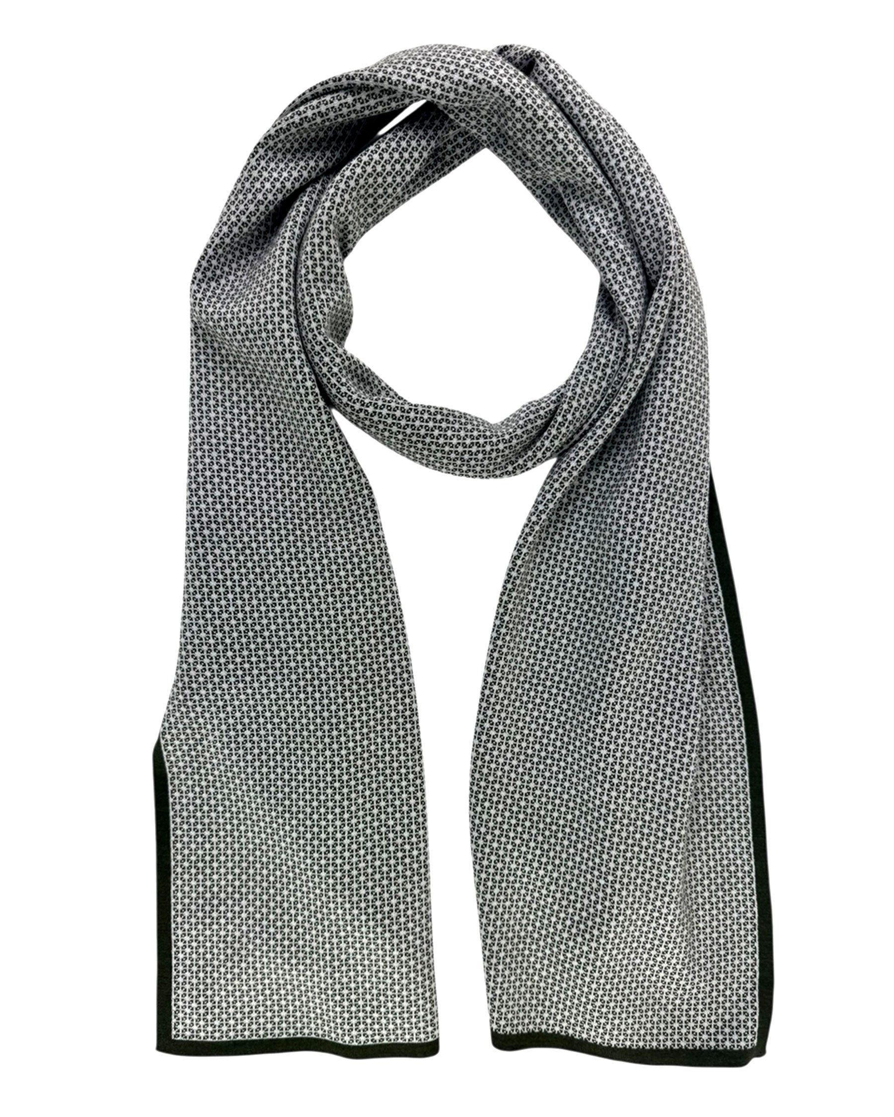 Authentic Cesare Attolini scarf, dark green with light gray geometric design, inverted reverse colors, no fringe, fancy medium weight wool/ silk, made in Italy. Cesare Attolini: sartorial quality men designer shawls and scarves, men collection at outlet prices. Shop discount Attolini scarves.