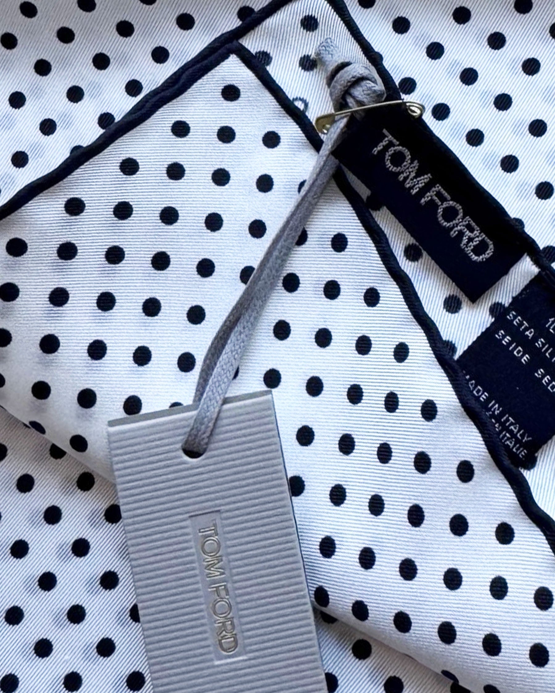 Genuine Tom Ford silk pocket square, white black dots design, hand stitched border, hand made in Italy. Authentic Tom Ford men collection online at outlet prices. Shop Tom Ford pocket squares.