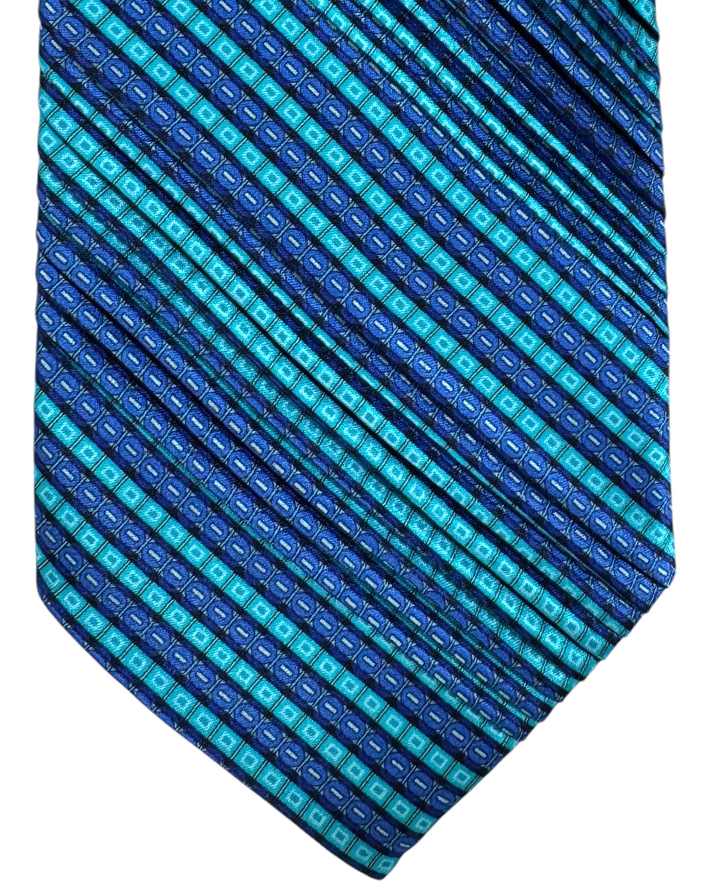 Genuine Vitaliano tie, aqua blue stripes design, pleated silk tie, hand made in Italy. The Vitaliano Pancaldi tie is a very unique tie, made in very limited quantities, the tie features a golden chain logo hanger at the back loop. Shop all Vitaliano pleated ties at discount prices, luxury men designer gifts.