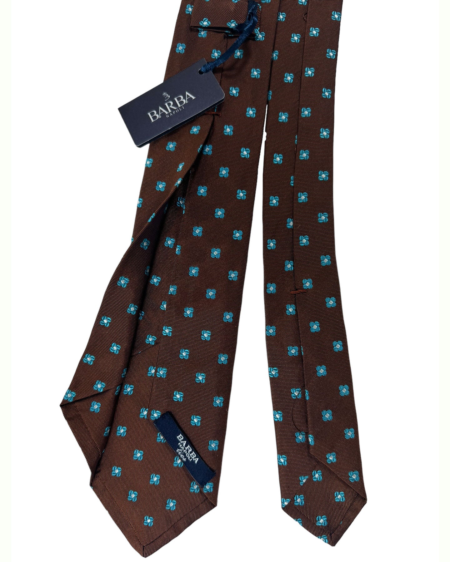 Authentic Barba sevenfold tie with brown / aqua / silver mini geometric design, silk, sevenfold construction, hand made in Italy. Stylish, elegant and sophisticated, genuine Barba Napoli ties, sartorial tailoring, hand made in Italy, made of the finest silk. Sartorial quality. Sevenfold Ties.