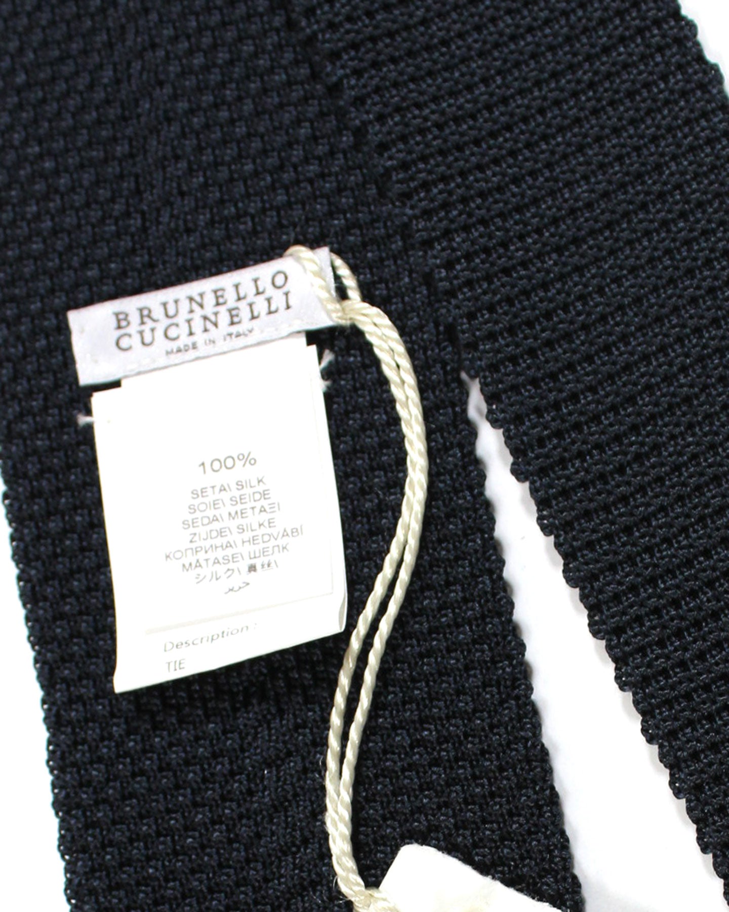 Authentic Brunello Cucinelli tie, navy, knitted silk square end tie with silver bottom edge, men collection, hand made in Italy. Genuine Brunello Cucinelli men sweaters, ties, dress shirts, the very best fabrics and quality.