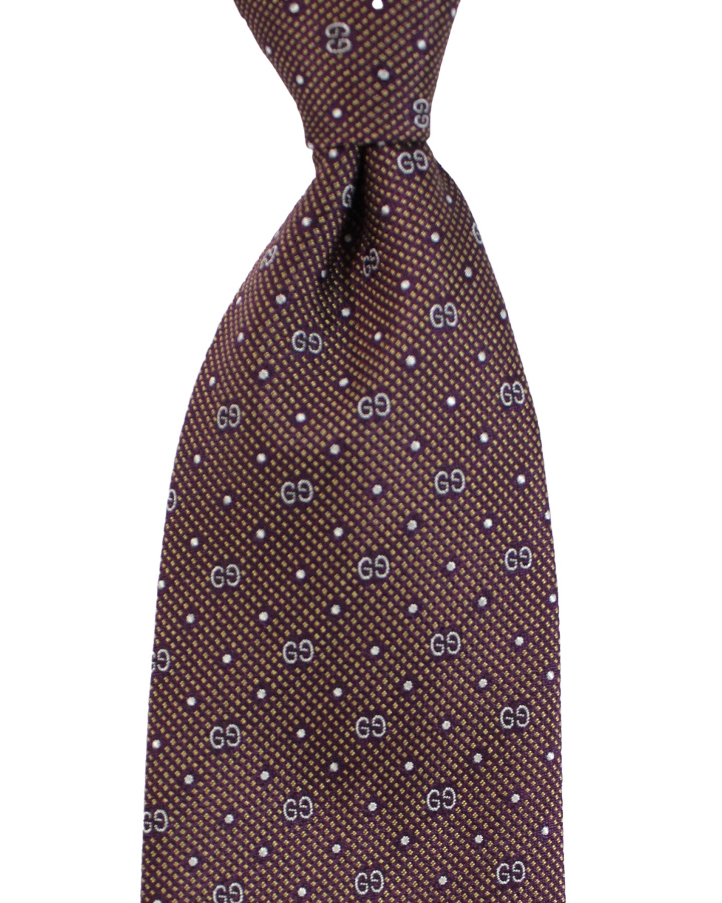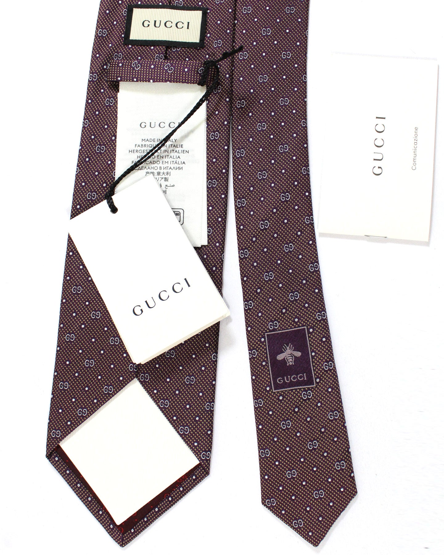 Authentic Gucci tie, signature with maroon and silver 'Martin' GG pattern, jacquard silk, hand made in Italy. Genuine Gucci men collection. Discount silk designer ties at outlet price. Shop for all Gucci GG pattern ties.