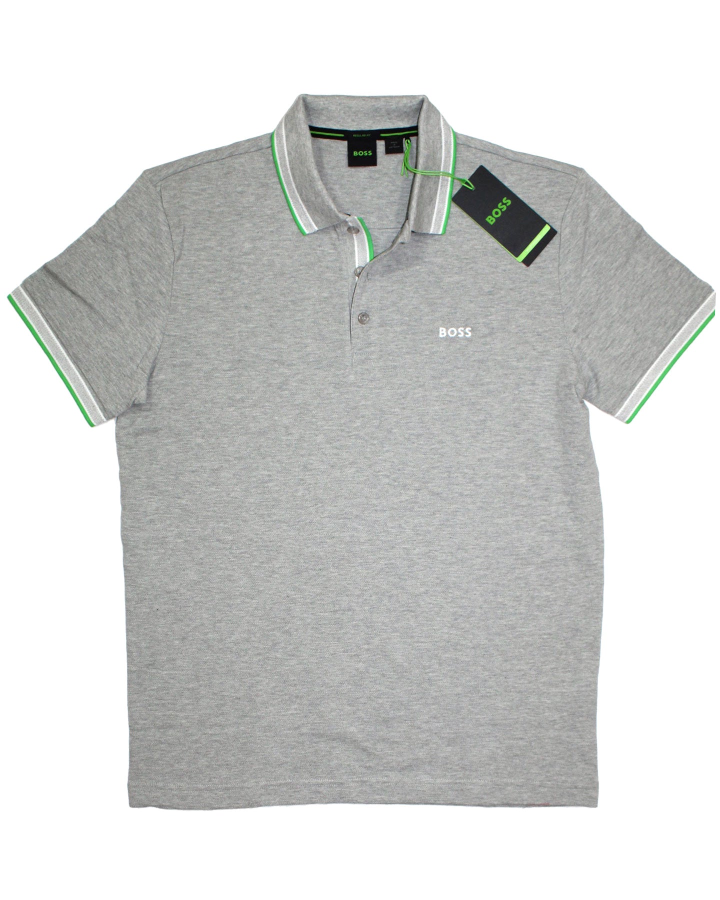 New Collection -Genuine Hugo Boss men polo shirt, regular fit, short sleeves, heather gray with green and white detail, embroidered BOSS logo on chest, cotton. Authentic discount Hugo Boss men clothes at outlet prices, men designer fashion.