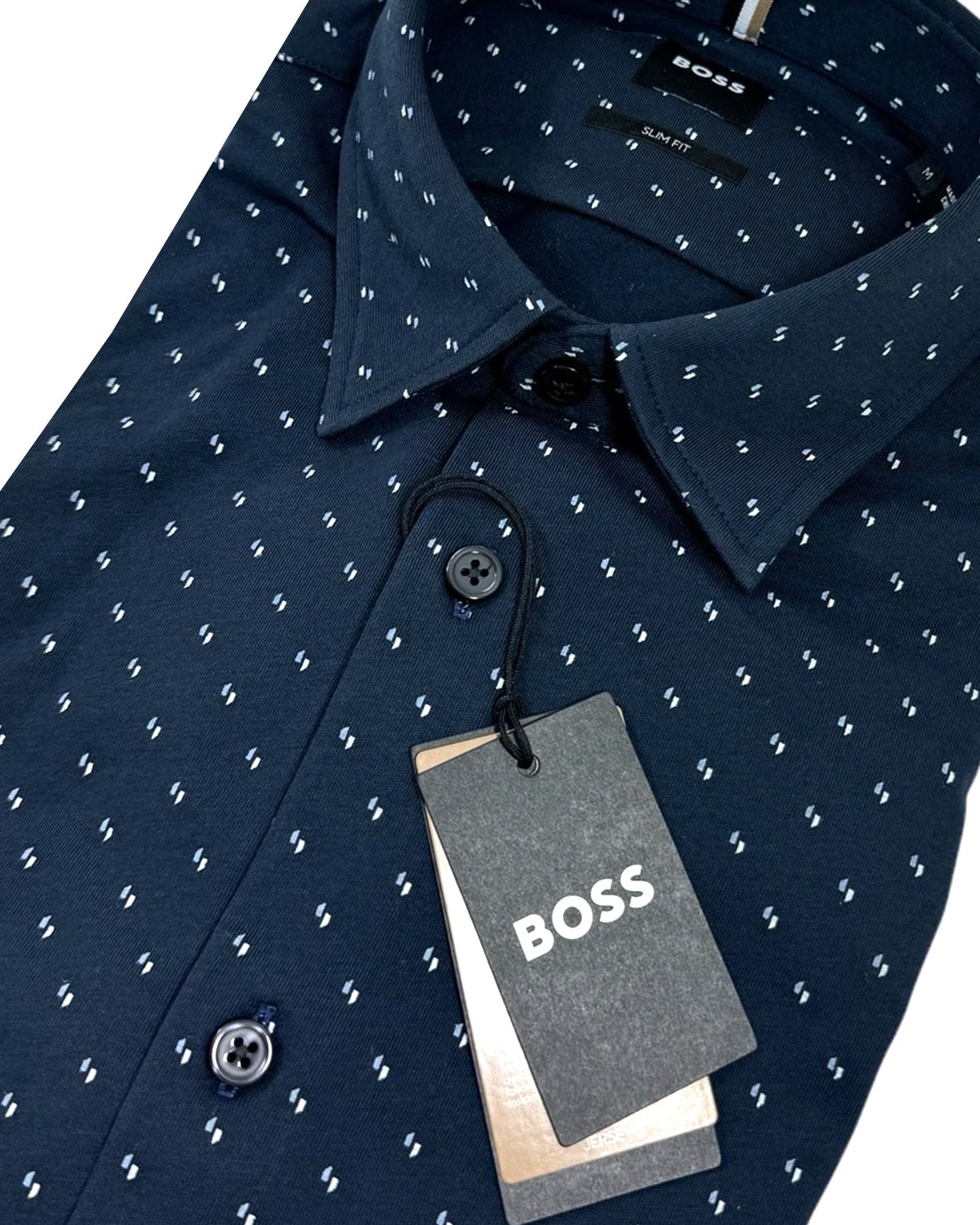 -Genuine Hugo Boss men sport shirt with modern midnight blue motif, slim fit, pointed collar, stretch cotton blend. Authentic discount Hugo Boss men clothes at outlet prices, men designer fashion.