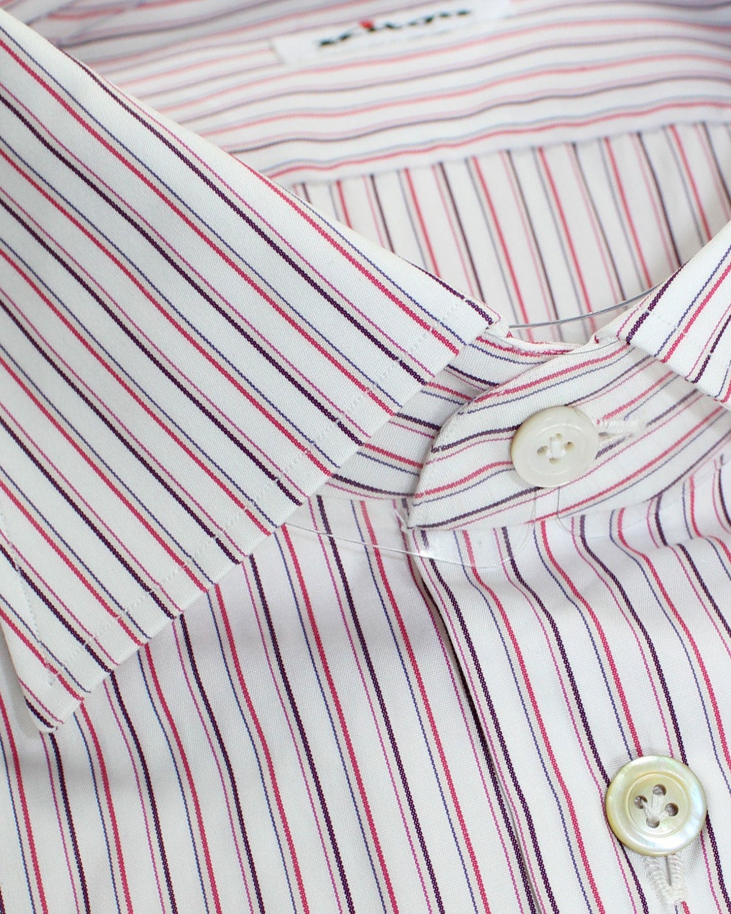 Sartorial: Authentic Kiton dress shirt, white / pink / purple stripes design, spread collar, mother of pearl buttons, cotton, hand made in Italy. Discount Kiton men dress shirts online. Shop for an excellent selection of sartorial quality Kiton dress shirts at outlet prices.