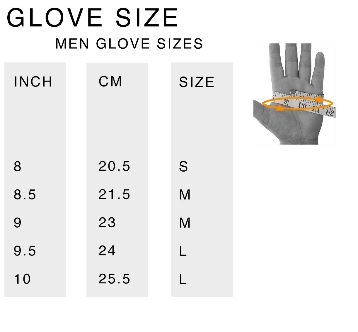 Men gloves size: measure your circumference of your hand at the widest point, excluding the thumb.