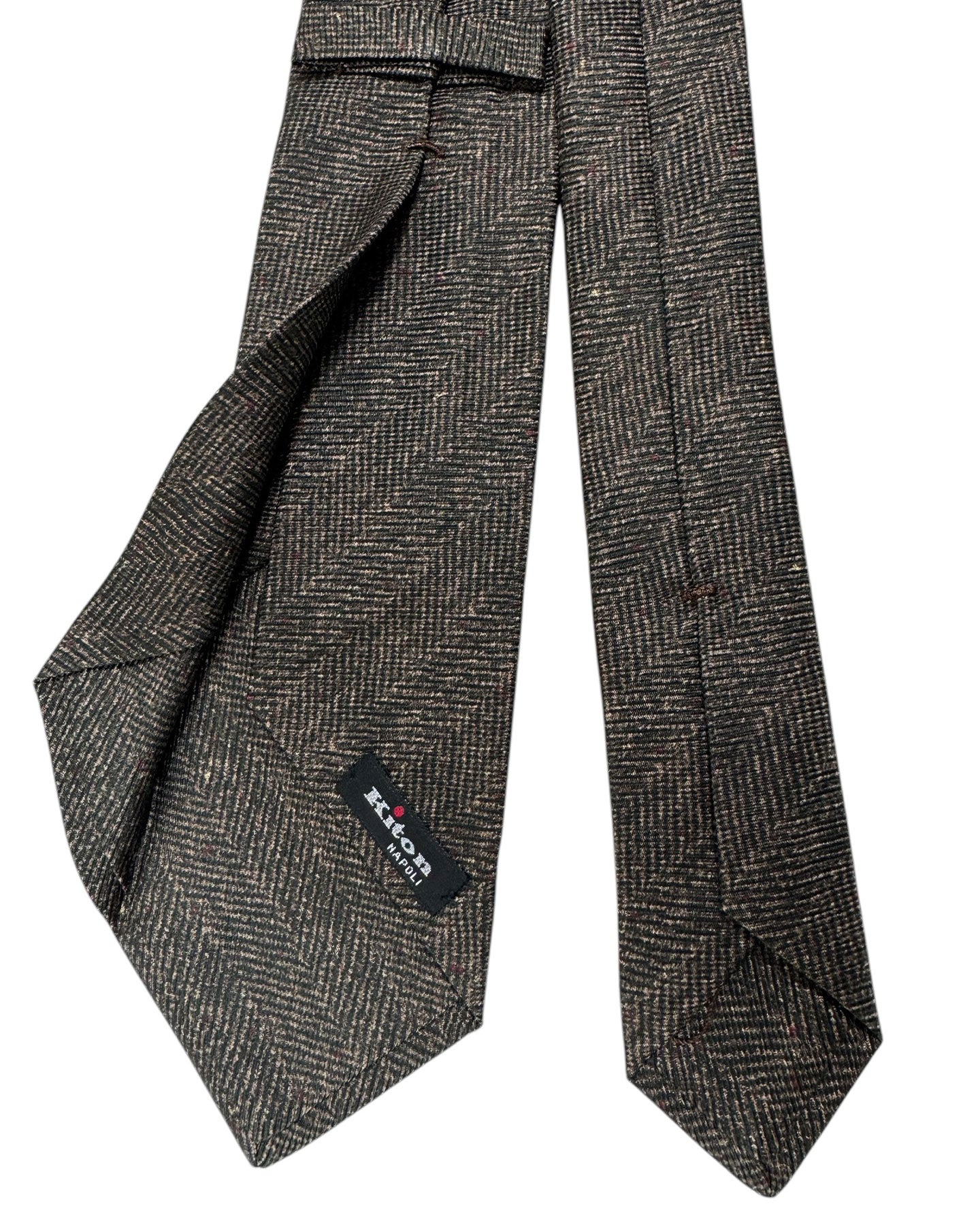 Authentic Kiton sevenfold tie, taupe black background with some (irregular) borwn dots design, silk, self tipped sevenfold tie, hand made in Italy. The Kiton tie: sartorial quality men's sevenfold ties.