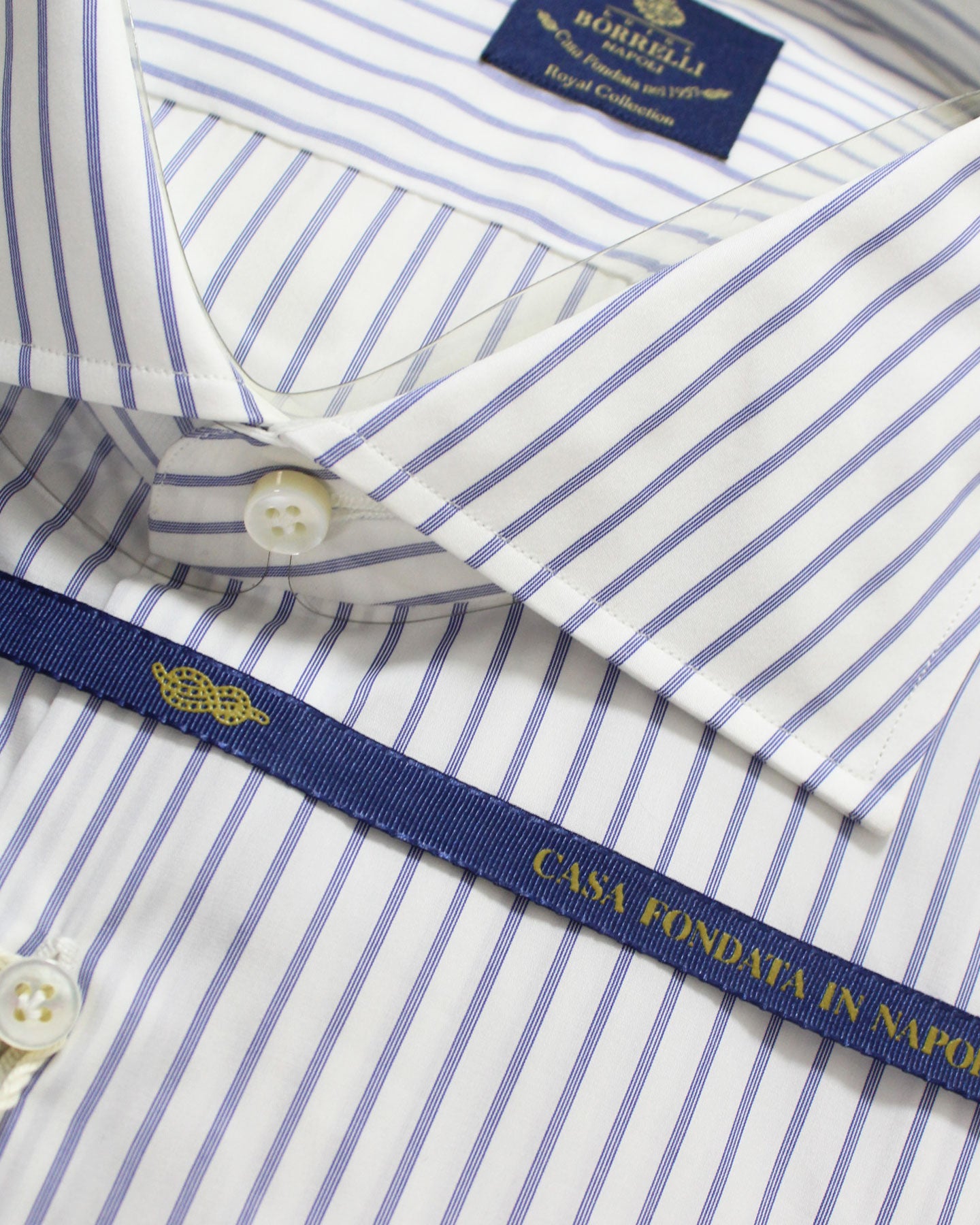 SALE - Sartorial dress shirt: Luigi Borrelli shirt, ROYAL COLLECTION, white navy quadruple stripes design, moderate spread collar, cotton, sartorial, hand made in Italy. Shop the sartorial dress shirts of Luigi Borrelli. Sartorial dress shirts at outlet prices.