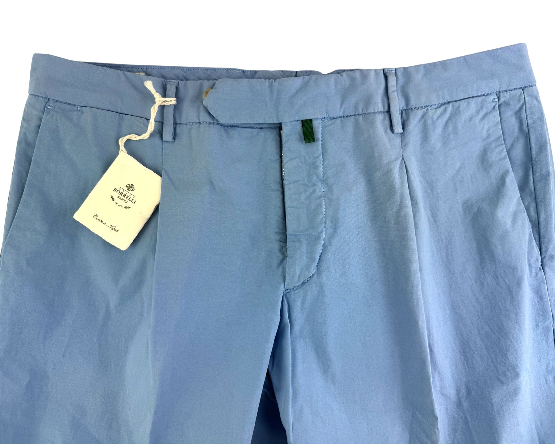 Genuine Luigi Borrelli pants, light blue, cotton, 'one pleat front', slant pockets, slim fit, cotton, zip fly, sartorial tailoring, hand made in Italy. Luigi Borrelli Napoli men collection, hand made jeans. View all shorts/ jeans/ pants.