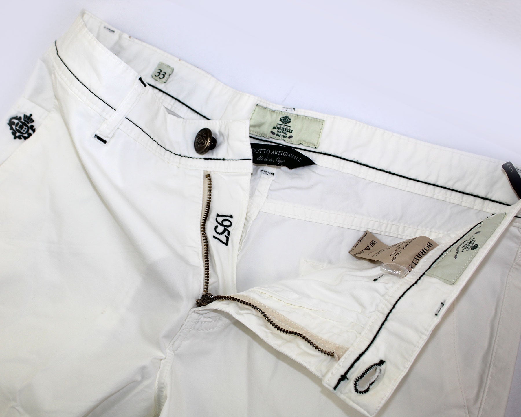 Genuine Borrelli pants, white, 5 pocket, slant pockets, slim fit, light weight cotton, zip fly, hand made in Italy. Luigi Borrelli Napoli men collection, hand made jeans. View all shorts/ jeans/ pants.