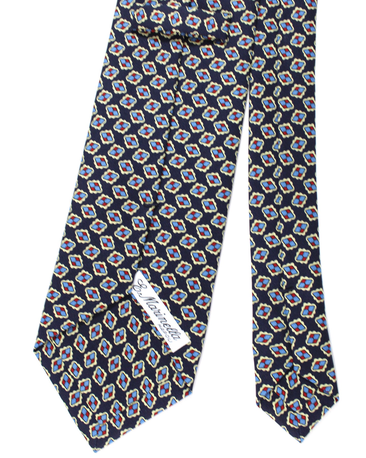 Genuine E. Marinella tie with a navy / blue / red geometric design, fancy hand printed silk, hand made in Italy. E. Marinella Napoli is a sartorial quality brand from Napoli, Italy.