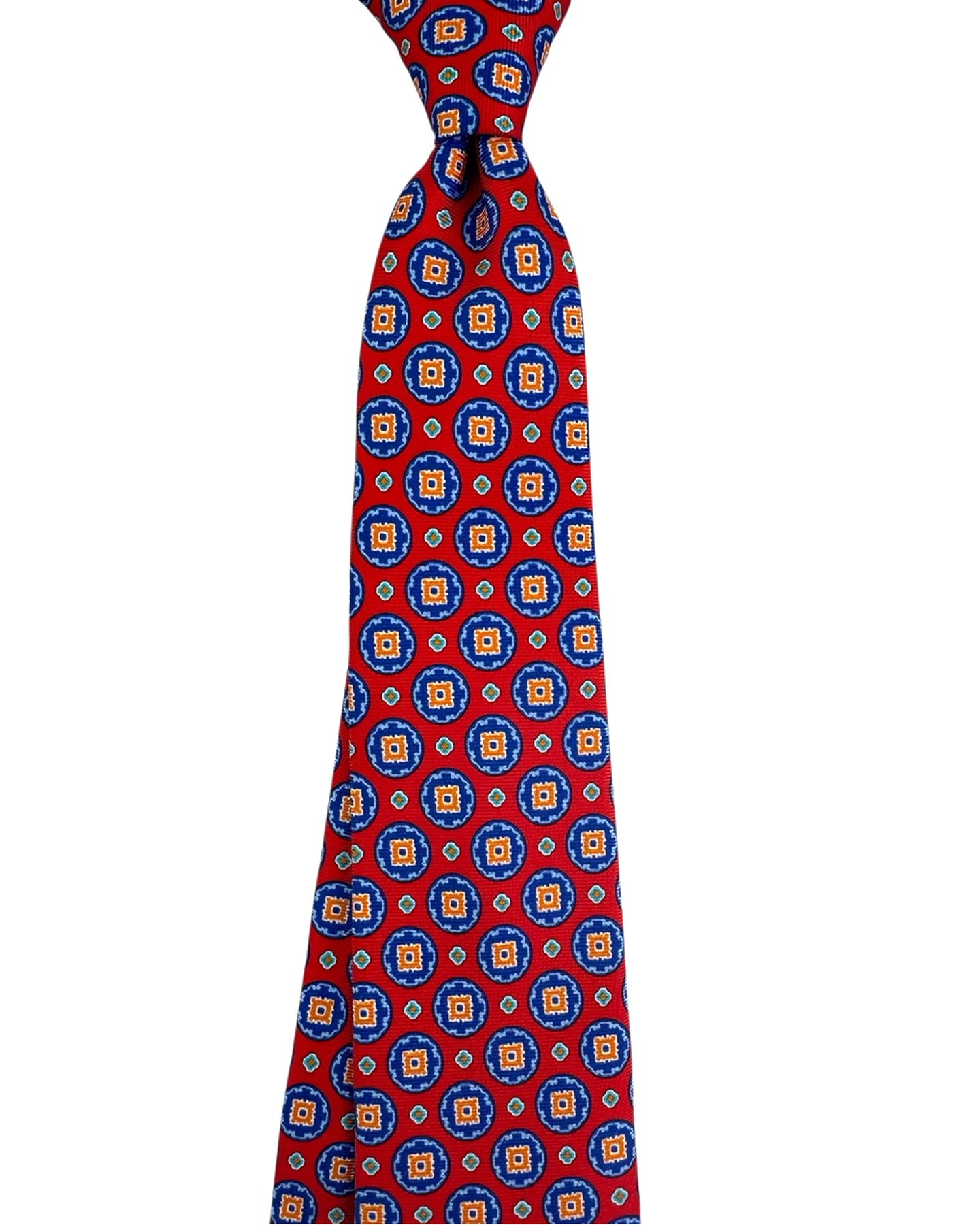 Kiton Sevenfold Tie Red Royal Blue Medallion Design