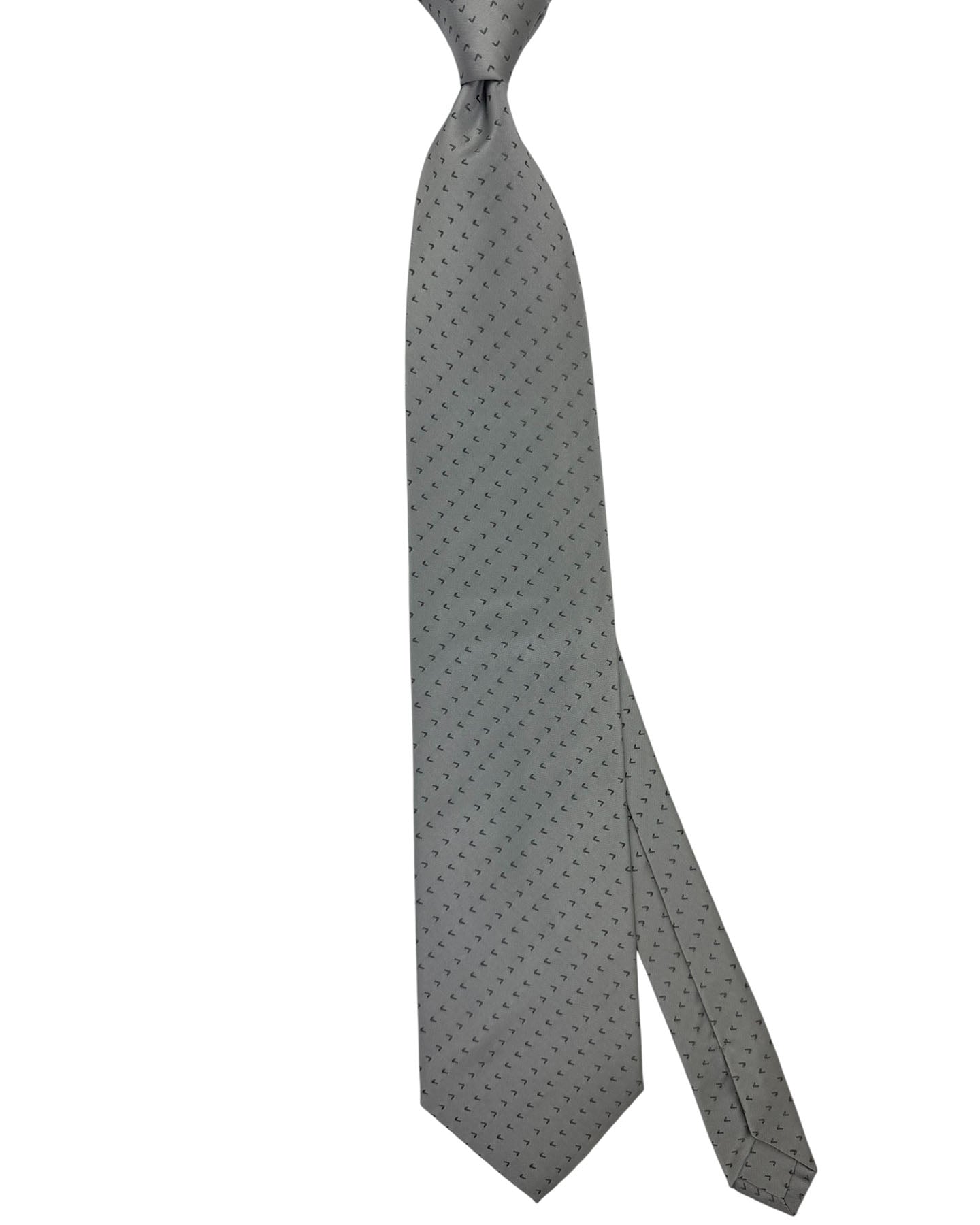 Genuine Valextra tie, gray background with a repeating arrow motif in black, wide 9.5cm width, jacquard silk, self tipped, high quality, hand made in Italy. Discount luxury designer ties, Valextra men fashion accessories at outlet prices.