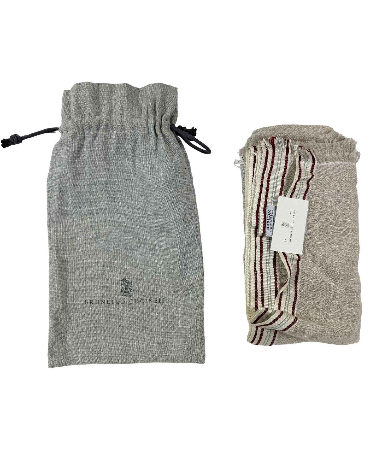 Spring Summer: Authentic Brunello Cucinelli scarf, beige gray white with maroon stripe silk/ cashmere/ linen, short eyelash fringe, made in Italy. Genuine discounted Brunello Cucinelli men suits, scarves, ties, dress shirts, the very best fabrics and quality.