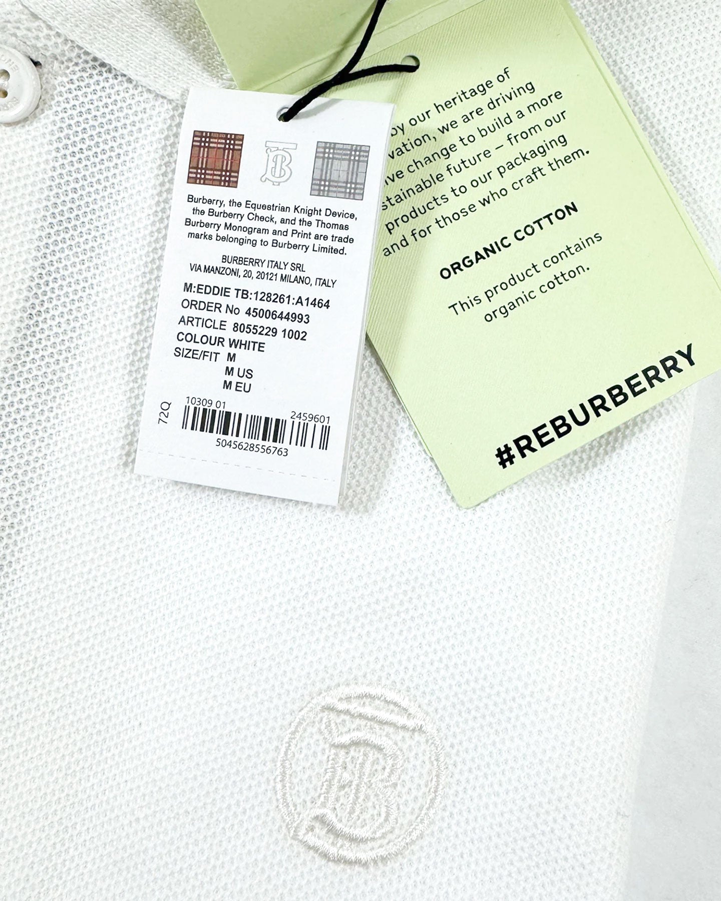 Authentic Burberry men polo shirts with monochrome TB logo: Thomas Burberry Monogram ('TB') design of the 2024 collection. An authentic Burbery polo shirt in cotton piqué embroidered with the initials of our founder, Thomas Burberry. The design is cut to a slim fit and lined with Burberry Check at the placket.