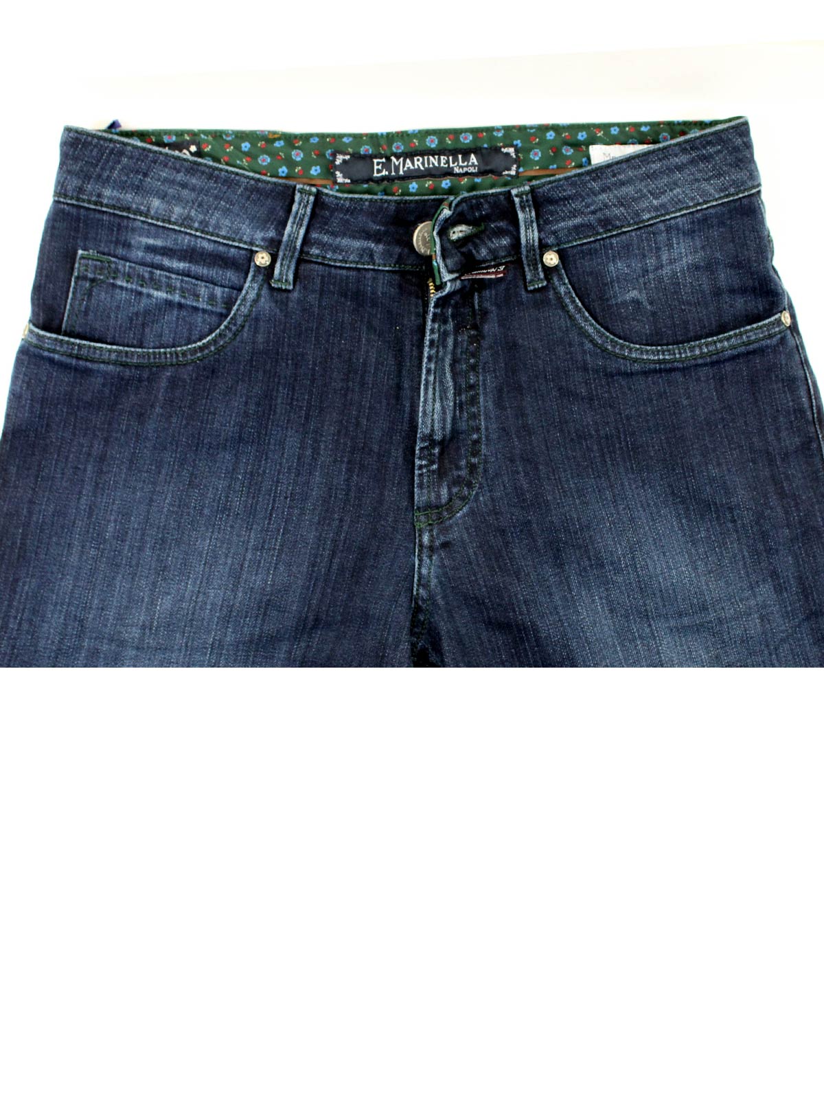 Sartorial quality men jeans: Genuine E. Marinella jeans, dark denim blue, military green stitching, slim fit, zip fly, hand made in Italy. E. Marinella Napoli men collection, hand made jeans. Shop E. Marinella jeans.