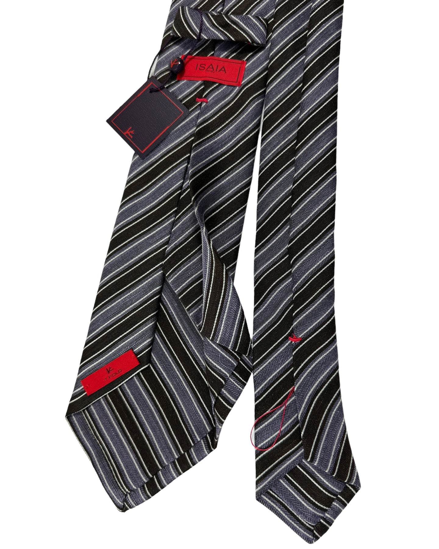 Genuine Isaia tie, dark brown / lavender-purple/ silver stripes design, linen / silk, sevenfold construction, hand made in Italy. Authentic Isaia Napoli men clothes, sartorial quality. Isaia men collection at outlet prices.