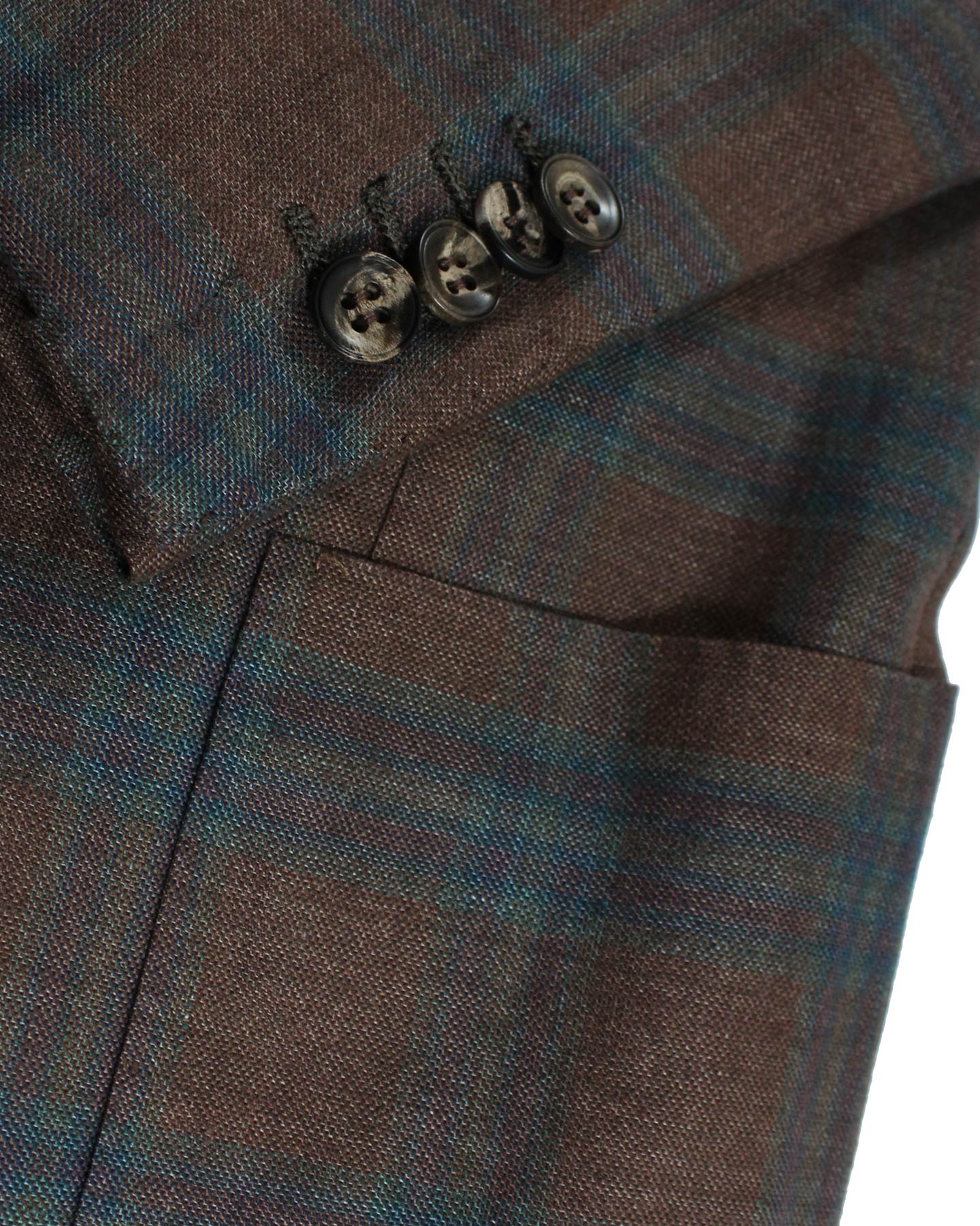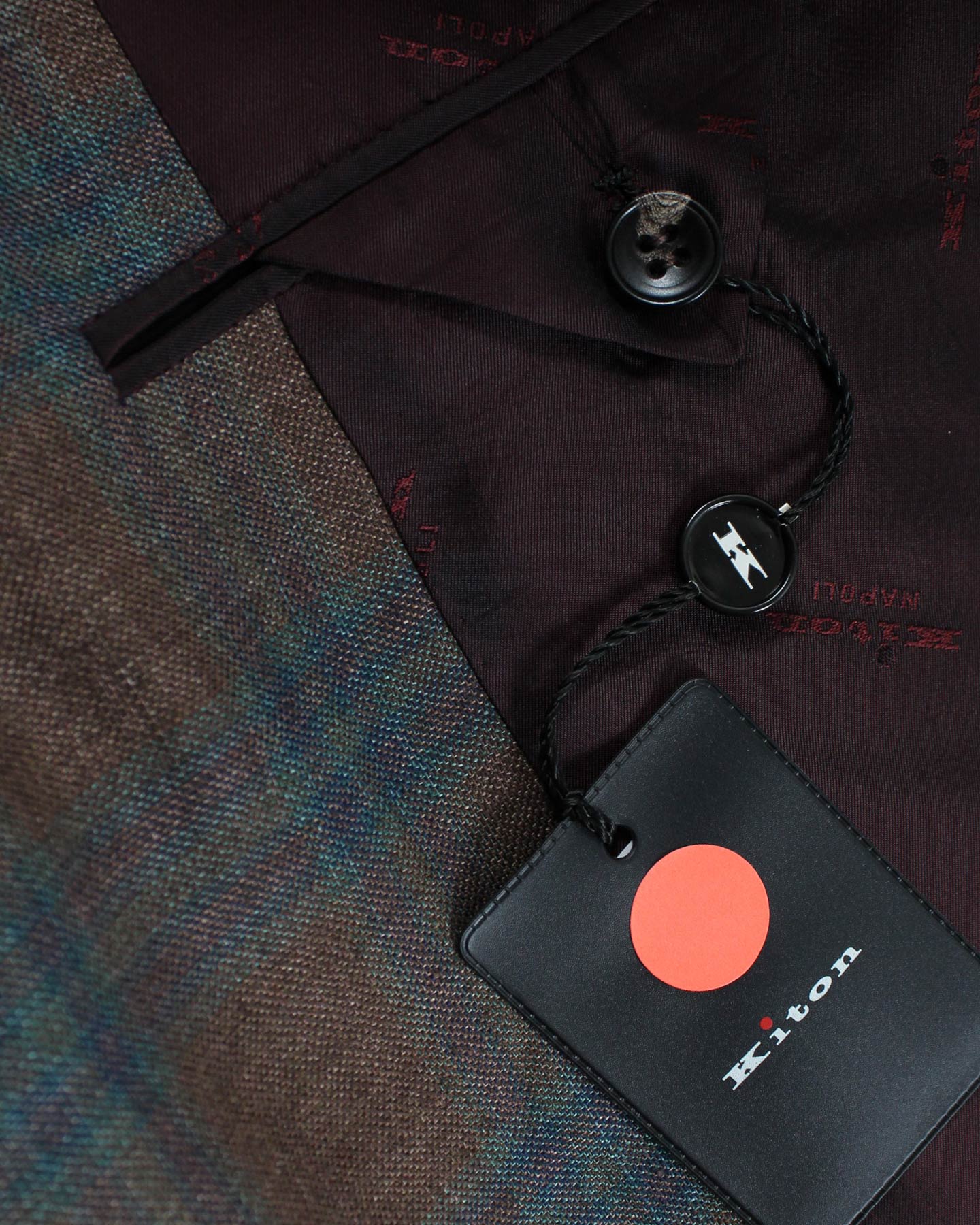 - REDUCED SALE: Genuine Kiton sport coat, brown plaid with subtle turquoise detail, 2 button, unlined construction, fancy cashmere/ linen fabrics, hand made in Italy. Sartorial/ bespoke quality Kiton men jackets and suits, hand made in Napoli, Italy.