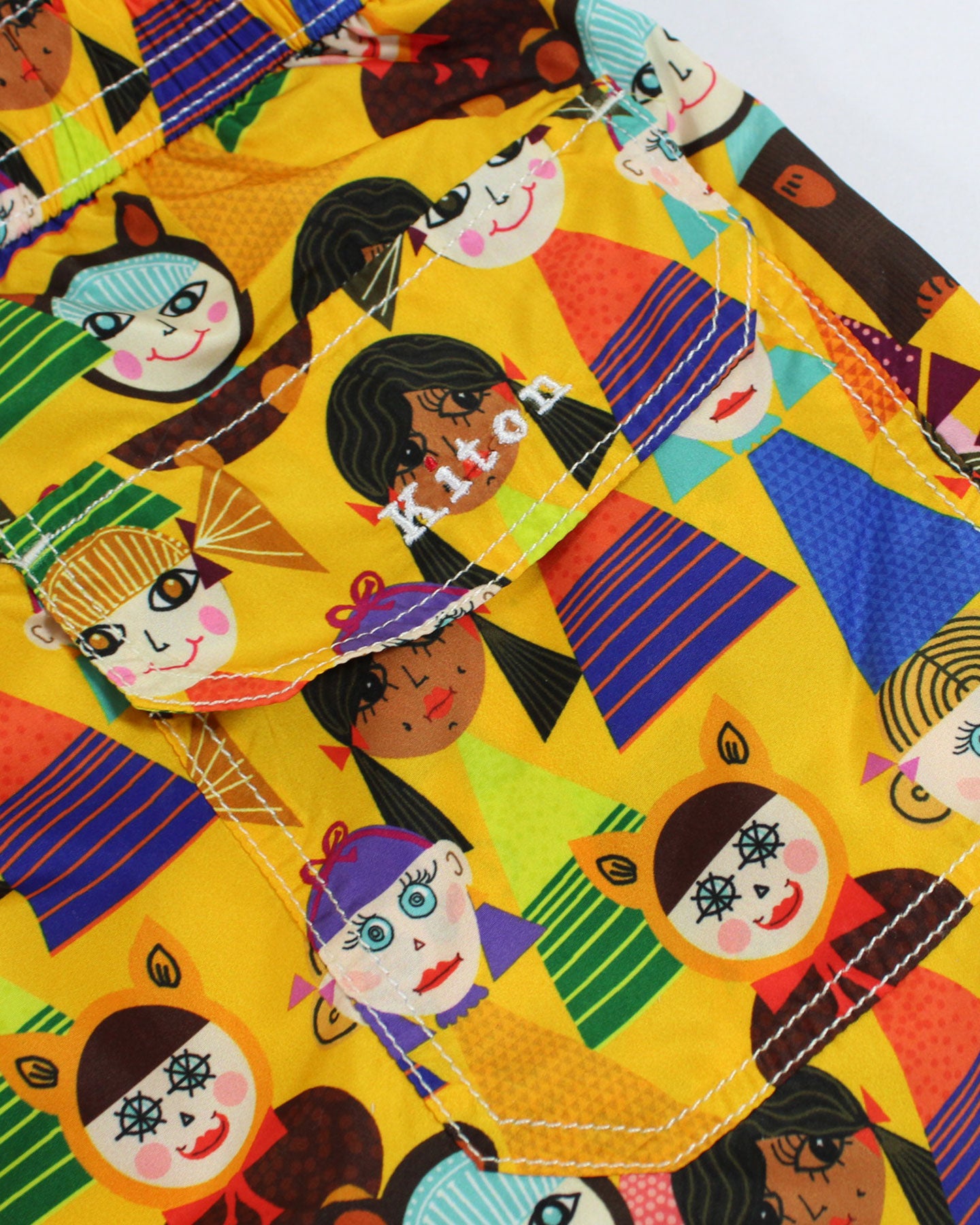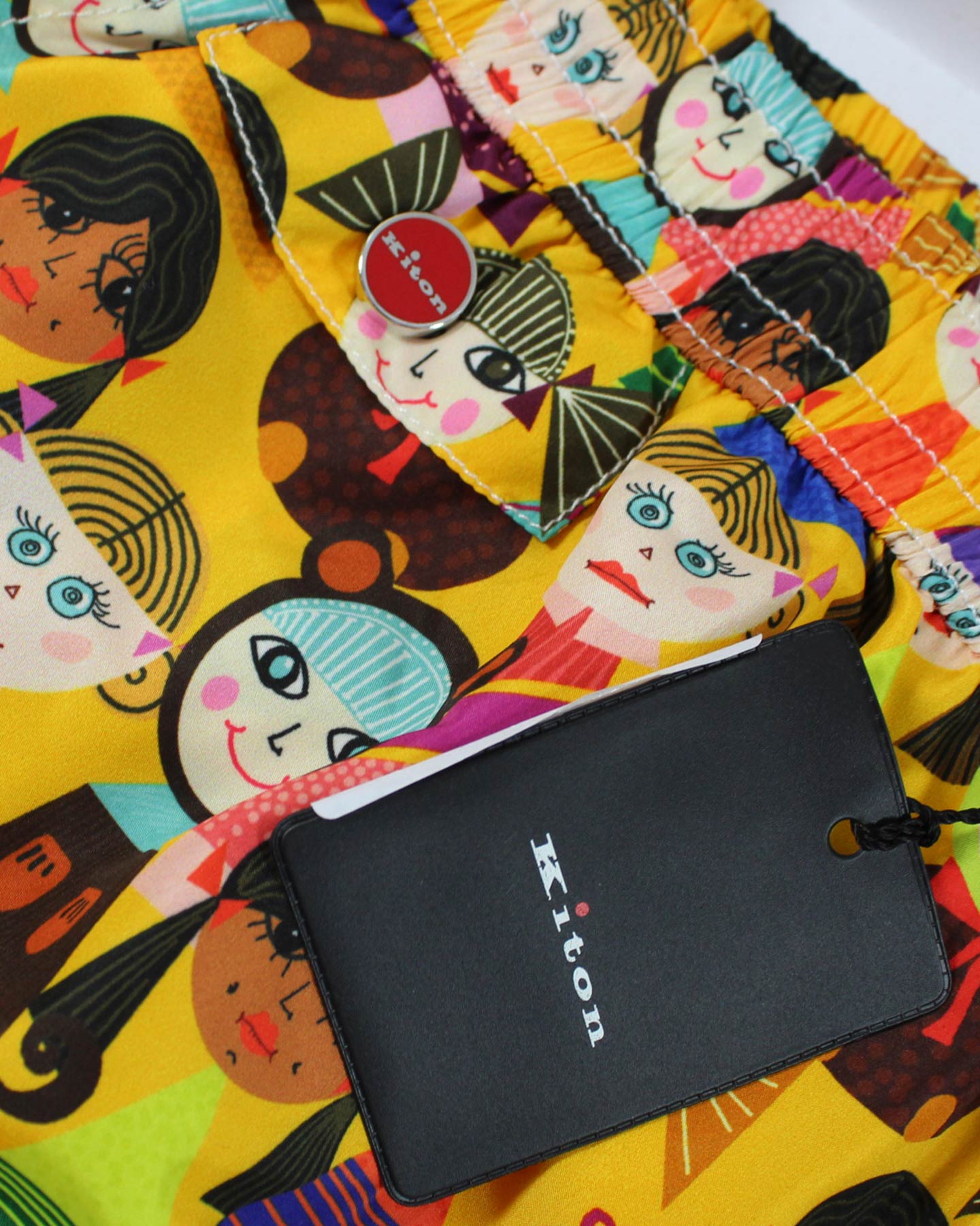 SALE - Genuine Kiton swim shorts, white / multi color novelty design, front pocket with fancy Kiton logo button, luxury swim trunk, back pocket with Kiton logo, hand made in Italy. Authentic Kiton Napoli. View all Kiton men accessories | swimwear.