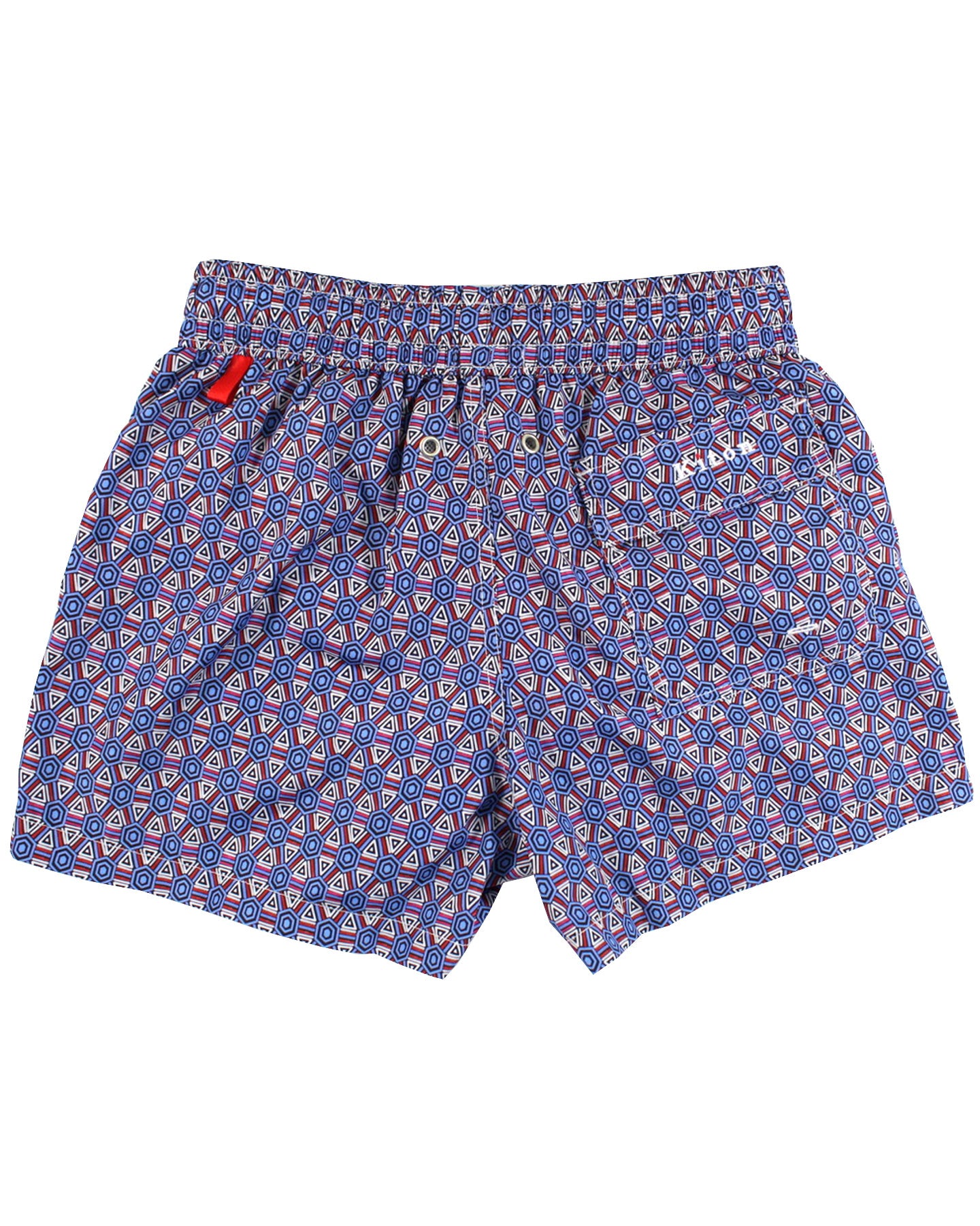 Genuine Kiton youth swim shorts, blue / maroon geometric design, luxury swimwear, back pocket with Kiton logo, made in Italy. Authentic Kiton beachwear. View all Kiton kids swim shorts | swimwear.