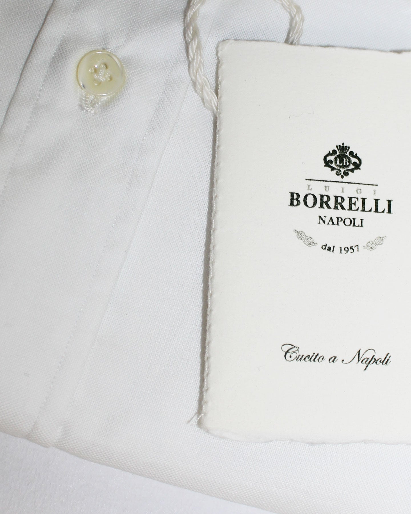 Authentic Luigi Borrelli button down shirt, modern fit, white, cotton, sartorial, 8 steps by hand, made in Napoli, Italy. Shop the sartorial dress shirts and ties of the Luigi Borrelli men collection. Shop button down shirts.