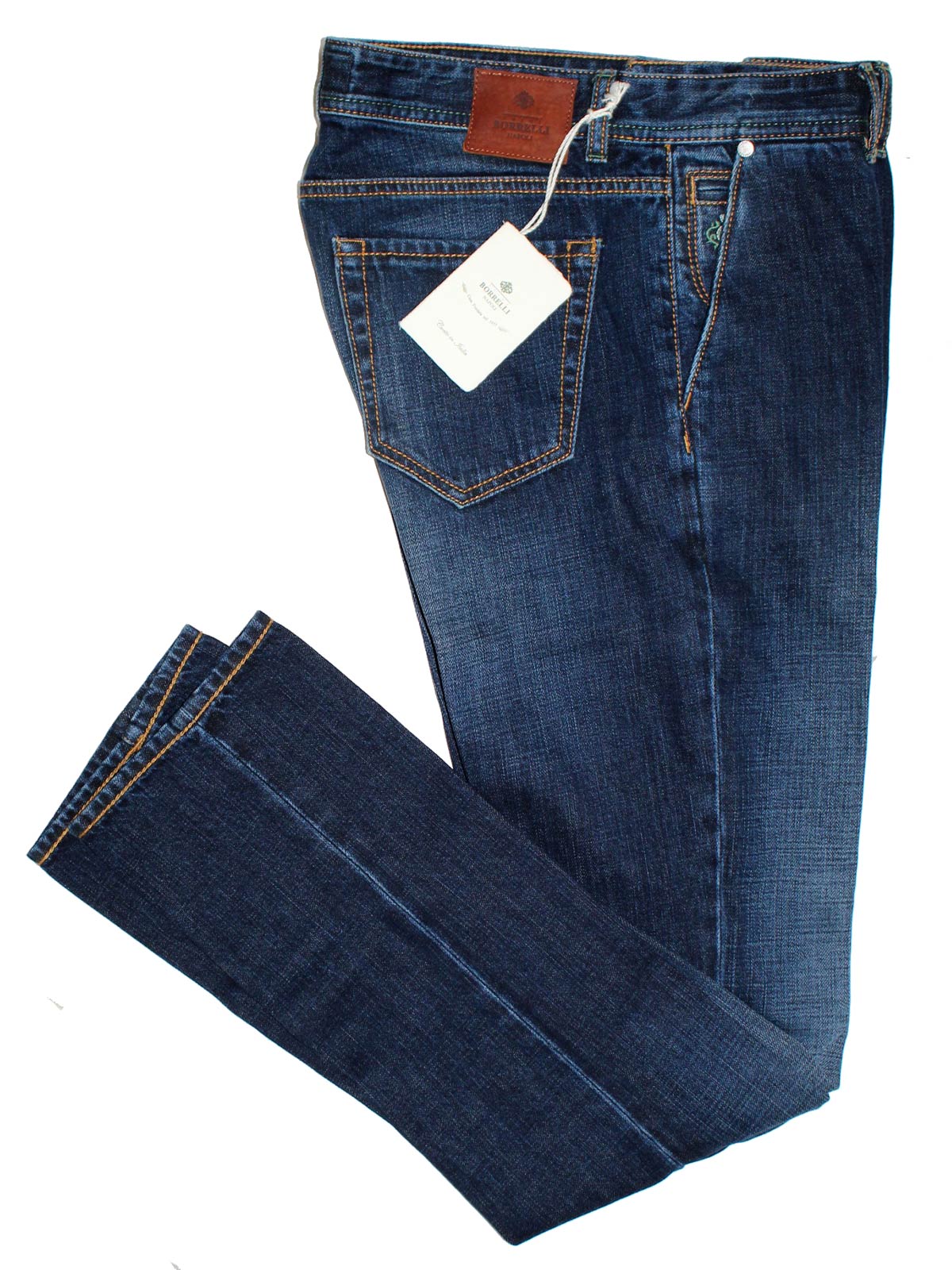 REDUCED - SALE - Genuine Borrelli pants, dark denim blue, slant pocket men jeans, slim fit, medium weight cotton, zip fly, hand made in Italy. Luigi Borrelli Napoli men collection, hand made jeans. View all shorts/ jeans/ pants.