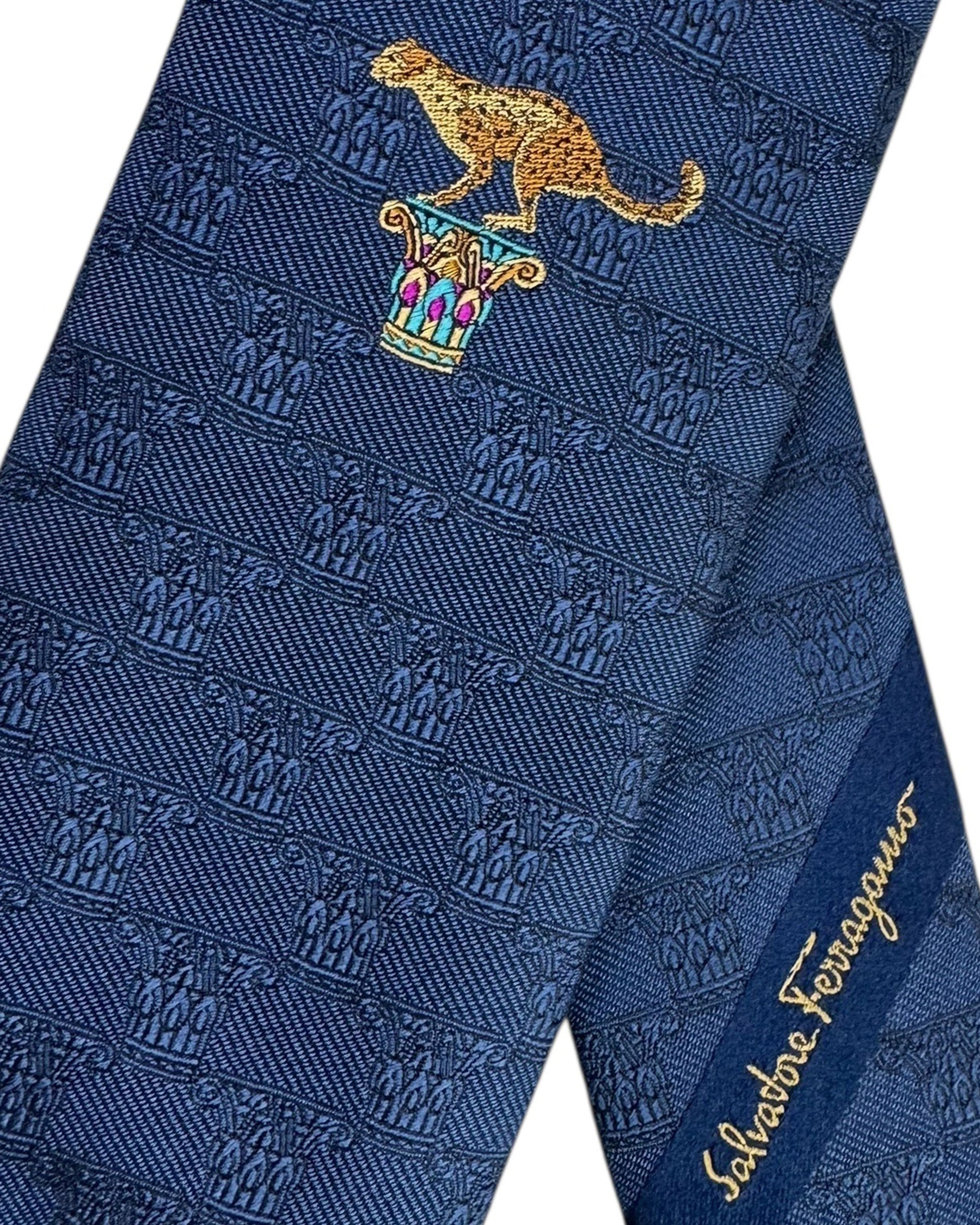 SALE - Authentic Salvatore Ferragamo tie, royal blue tonal with jaguar, narrow 7cm cut, jacquard silk, hand made in Italy. Genuine discount Ferragamo ties online, Ferragamo men collection at outlet prices. The most popular high-end novelty tie in the world.