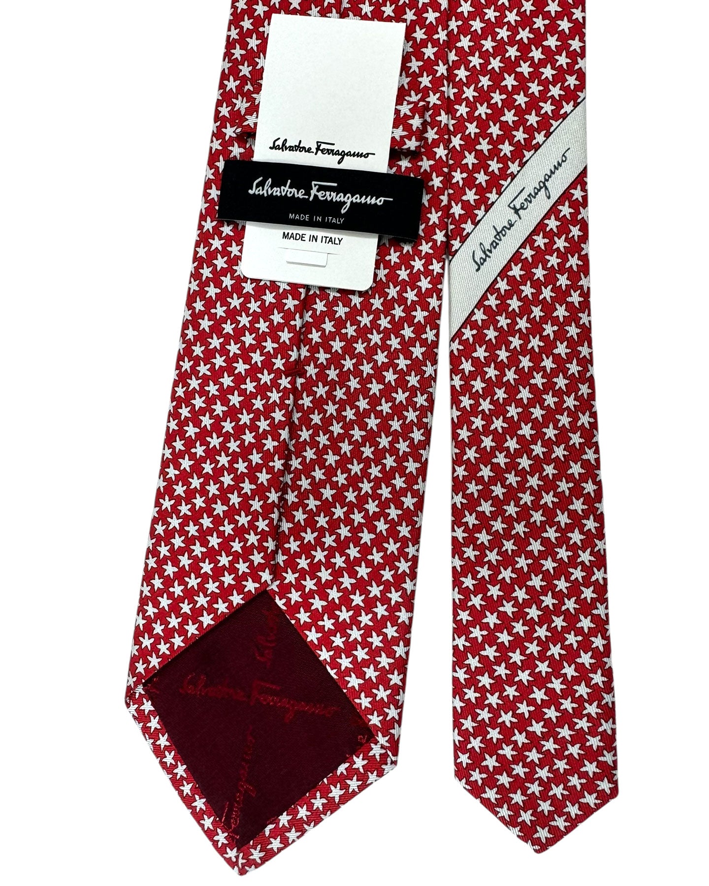 SALE - Men collection: Authentic Salvatore Ferragamo tie, red starfish novelty design, printed silk, hand made in Italy. Original Salvatore Ferragamo ties online, men collection.