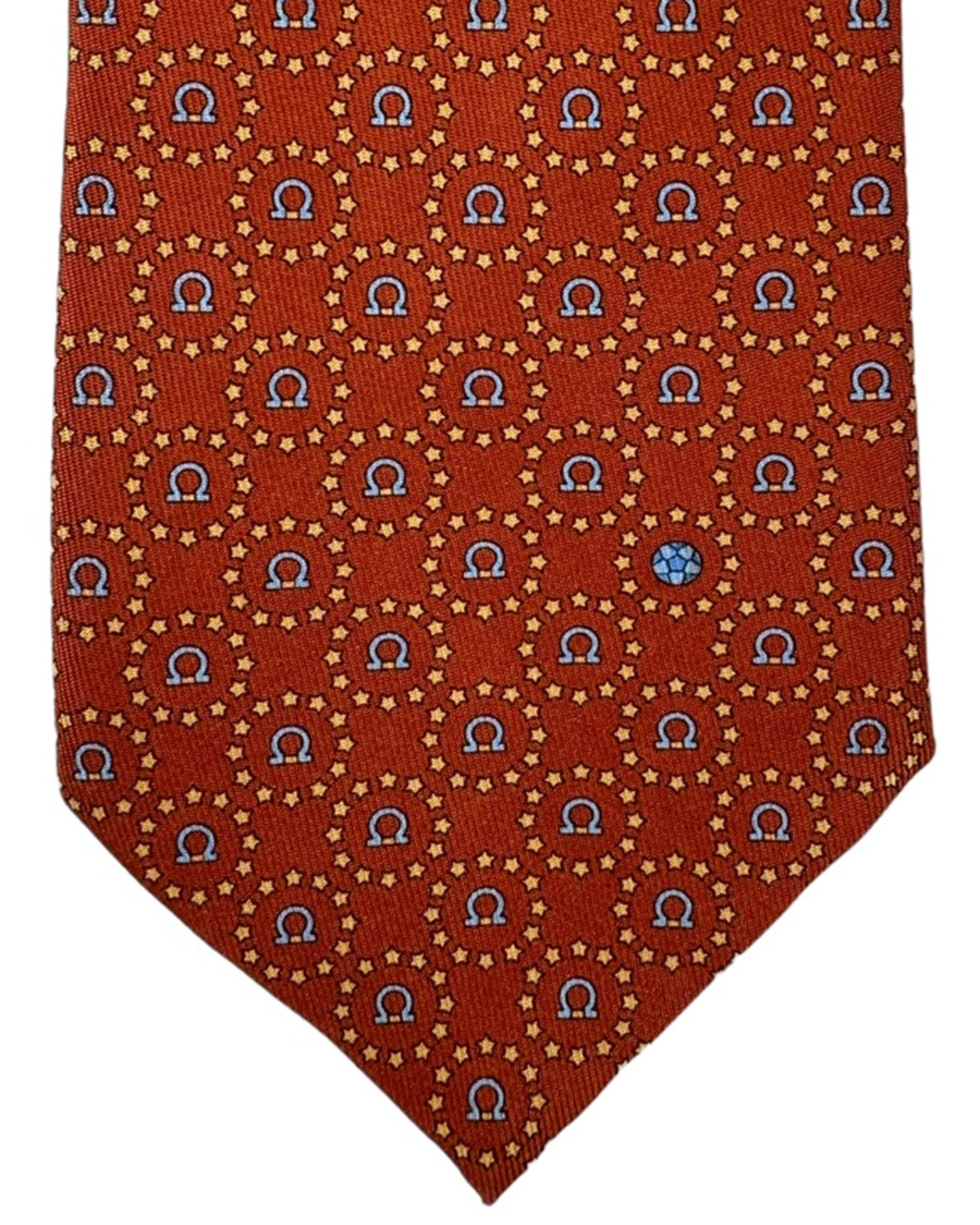 Men collection: Authentic Salvatore Ferragamo tie, signature rust-orange Gancini with circle mini stars design, twill silk, hand made in Italy. Original Salvatore Ferragamo ties online, authentic men collection luxury accessories.