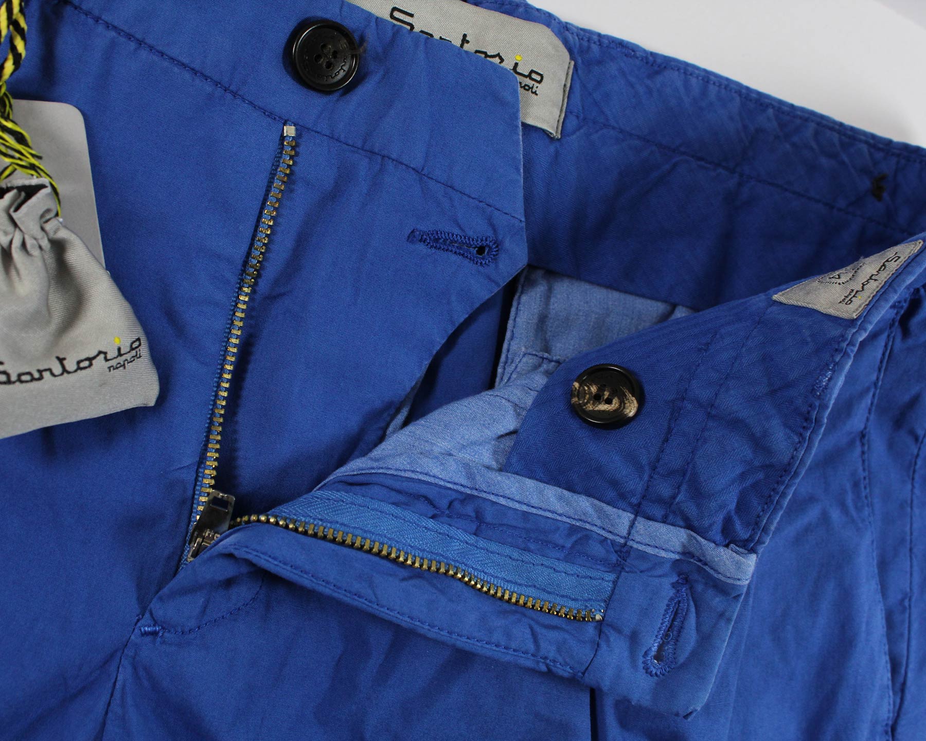 Authentic Sartorio pants, royal blue light weight (summer fabrics) stretch cotton, slim fit, pleated front button side straps to tighten waist, zip fly, made in Italy. Genuine Sartorio Napoli men collection, sartorial pants. View all luxury jeans/ pants.