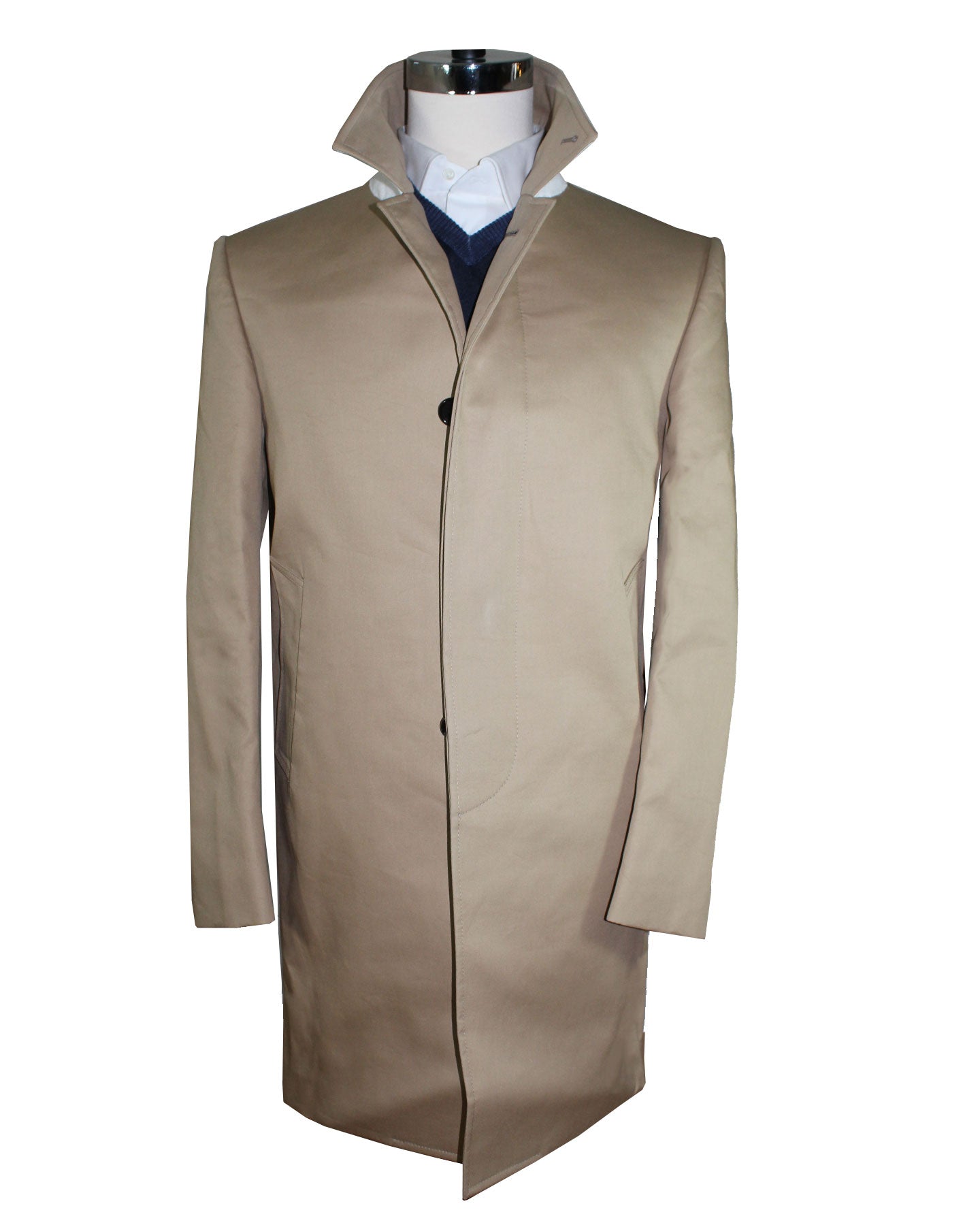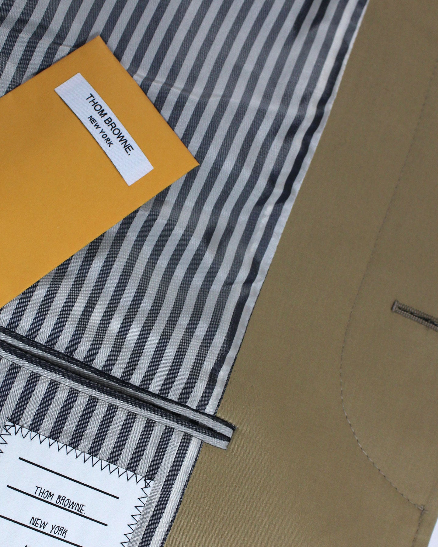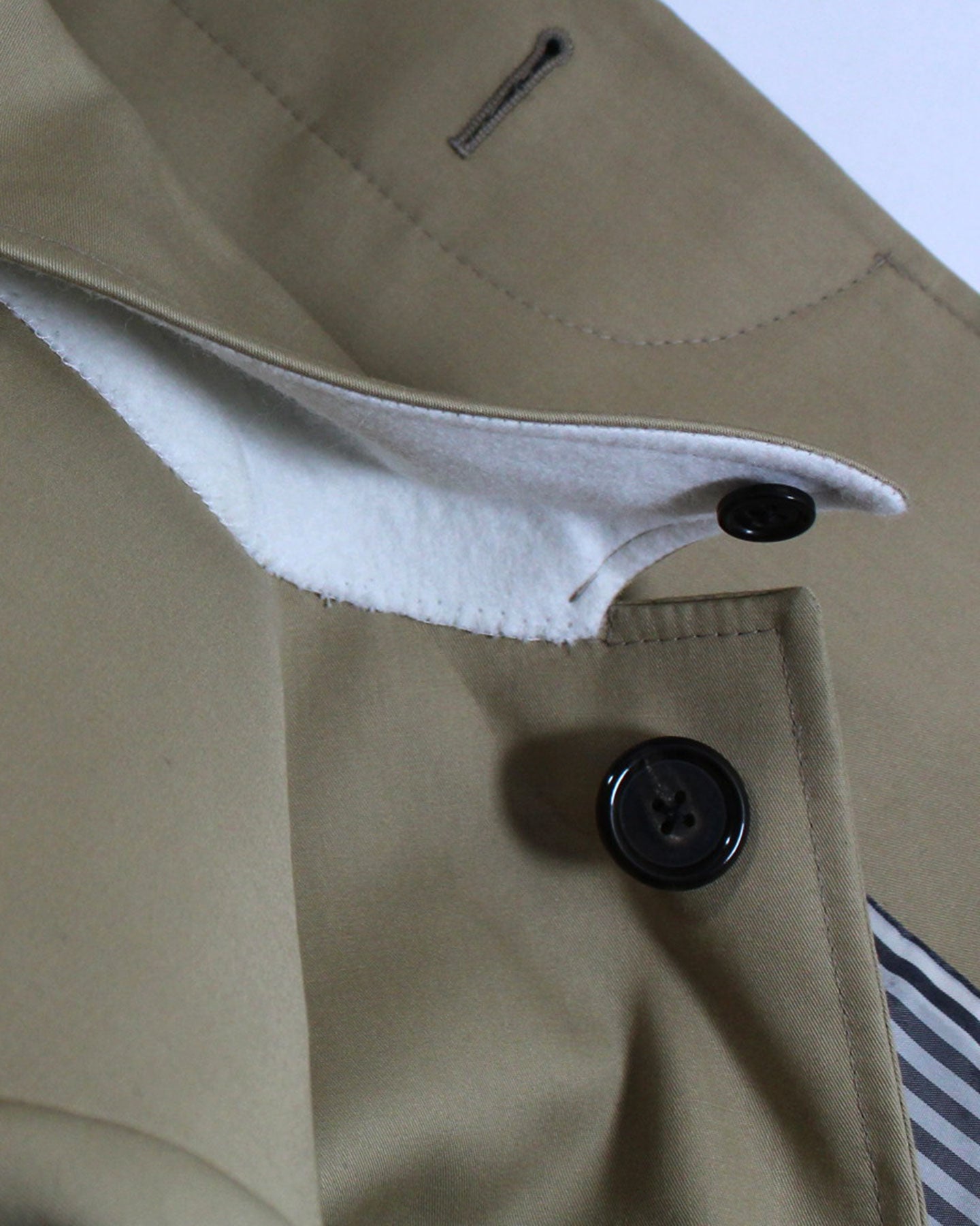 REDUCED - SALE : Genuine Thom Browne trench coat, khaki, covered button front, 35" length, pretty short 25 3/4" sleeves, buttoned cuffs (functional) with signature striped grosgrain trim, made in Italy. Excellent quality coat with signature Thom Browne details, artisan Italian tailoring, Thom Browne sport coats and suits, men collection.