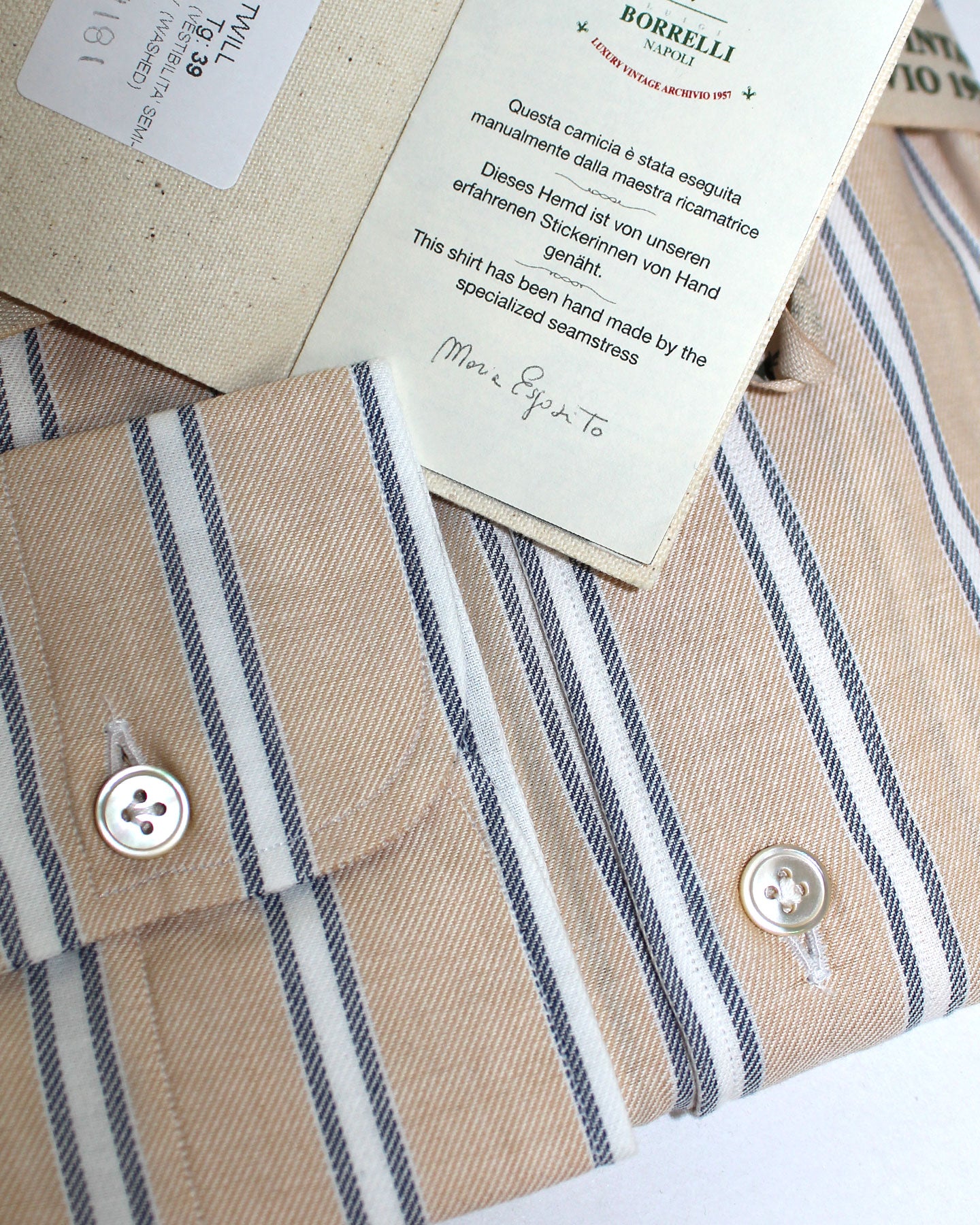 SALE - Summer Collection: Authentic Luigi Borrelli sport shirt, modern fit, cream navy white striped pattern, (soft) spread collar, cotton, Luxury Vintage Archivio 1957, 8 steps by hand, made in Napoli, Italy. Shop the sartorial dress shirts and ties of the Luigi Borrelli men collection.